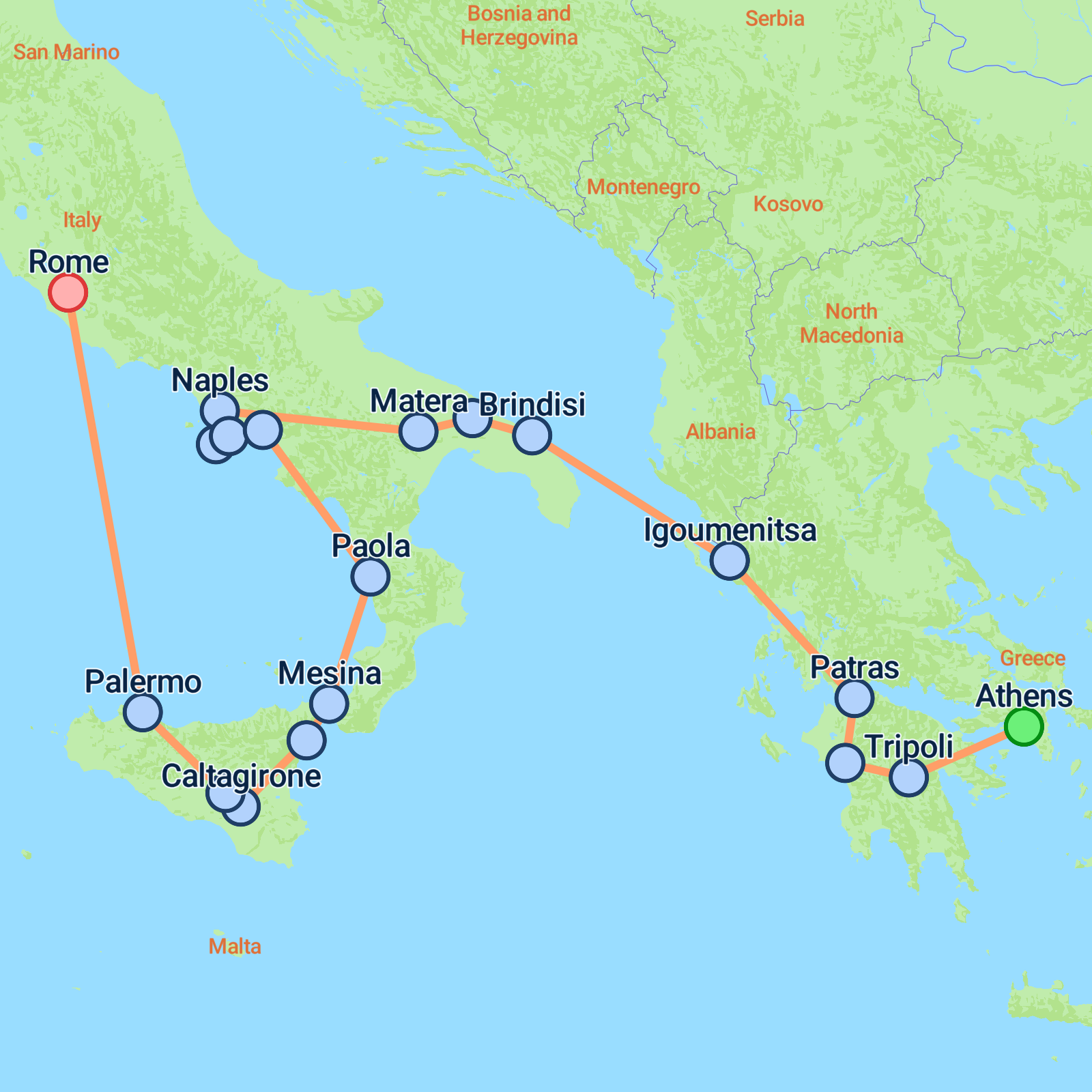 Embark on a captivating 12-day journey from Athens to Rome, uncovering the rich histories and vibrant cultures of Greece and Italy. Start with a delightful city tour of Athens, then explore the wonders of the Peloponnese, including ancient Olympia and the striking Corinth Canal. Sail across the Ionian Sea to Brindisi, after which youll wander through the unique trulli of Alberobello and the ancient beauty of Matera. Discover the charms of Naples, Capri and Sorrento, before heading to Sicilys Taormina and Palermo. Finally, soak up Romes splendid history, marvelling at the grandeur of the Colosseum and Vatican City. Expect unforgettable experiences at every turn.