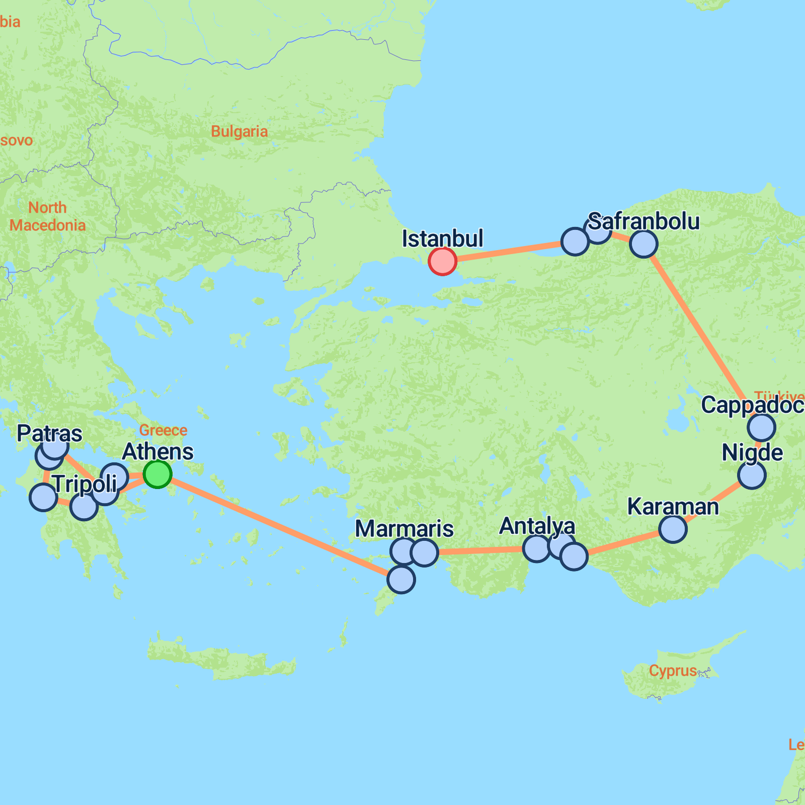 Set off on a vibrant 14-day adventure starting in Athens and concluding in Istanbul. This tour is a feast for history buffs and scenery lovers alike youll traverse the enchanting landscapes of Greece and Turkey, from the ancient ruins of Olympia and the famous Corinth Canal to the mesmerising rock formations of Cappadocia. Experience the cultural tapestry of Rhodes and the haunting beauty of Lycian Rock Tombs in Dalyan. Uncover vibrant city life in Athens, Marmaris, and Antalya, and enjoy a tranquil cruise on the Bosphorus. Expect stunning vistas, rich history, and delicious local cuisines throughout this unforgettable journey.