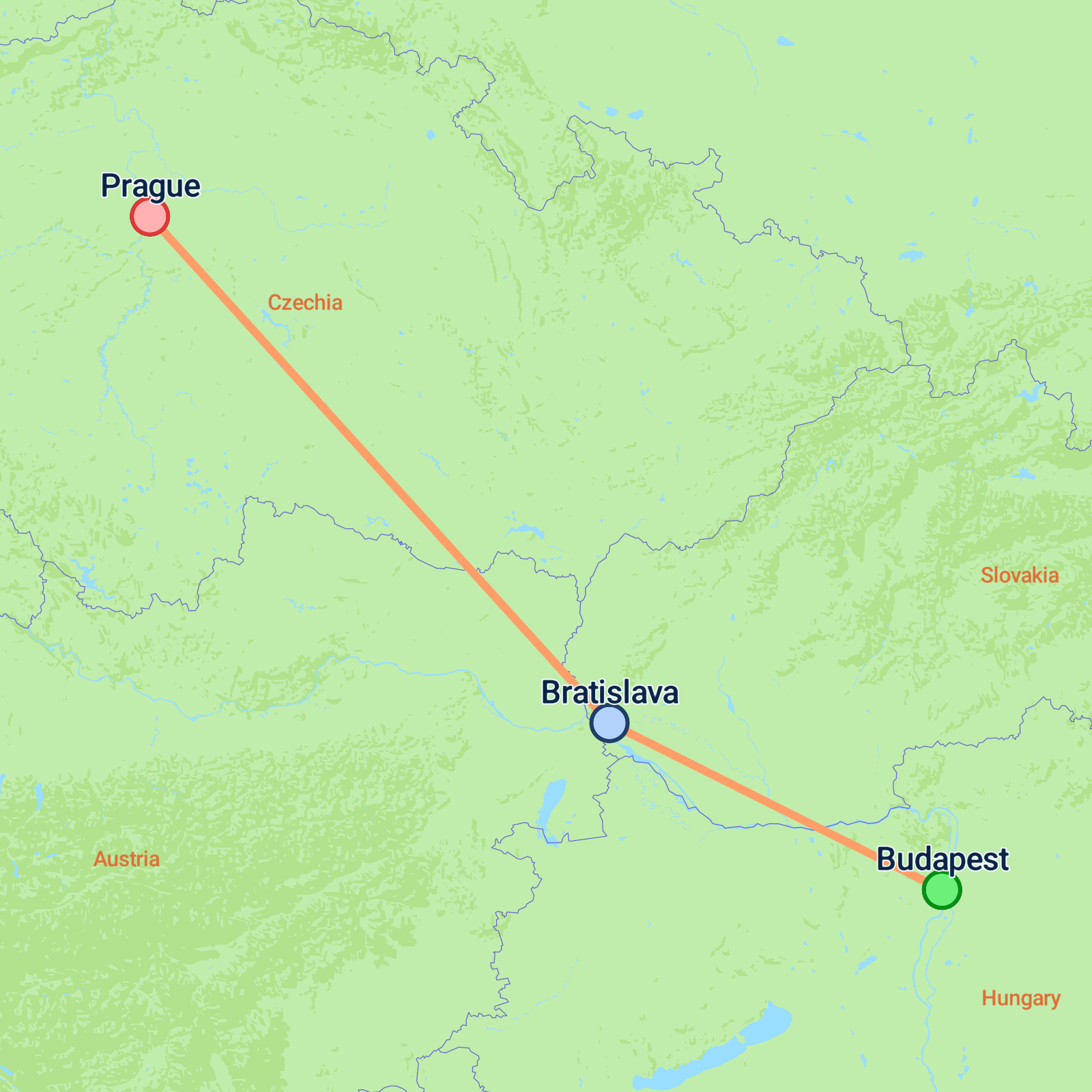 Kick off your adventure in the vibrant city of Budapest, where you'll experience its lively streets and stunning views along the Danube River. This five-day journey begins with a relaxing boat trip, offering a unique perspective of historic Buda and bustling Pest. From there, head to Bratislava's charming historic centre before arriving in the heart of Prague. Expect to see Prague's enchanting Old Town and iconic Prague Castle. Enjoy a scenic boat ride on the Vltava River and explore the citys myriad attractions at your leisure. End this remarkable trip in Prague, taking home unforgettable memories.