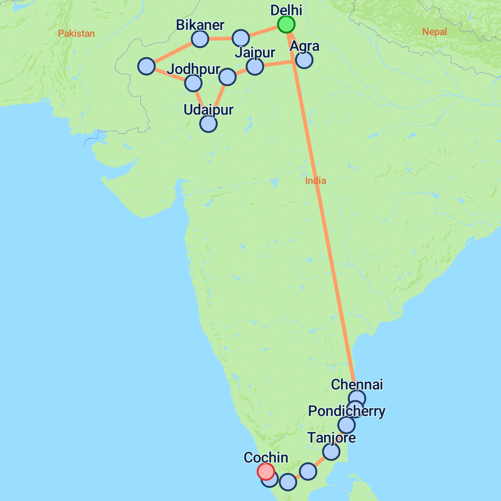 Mandawa - Delhi - Chennai - Mahabalipuram. You'll fly into Chennai International Airport, and from here can make your own way to our start hotel in Mahabalipuram.