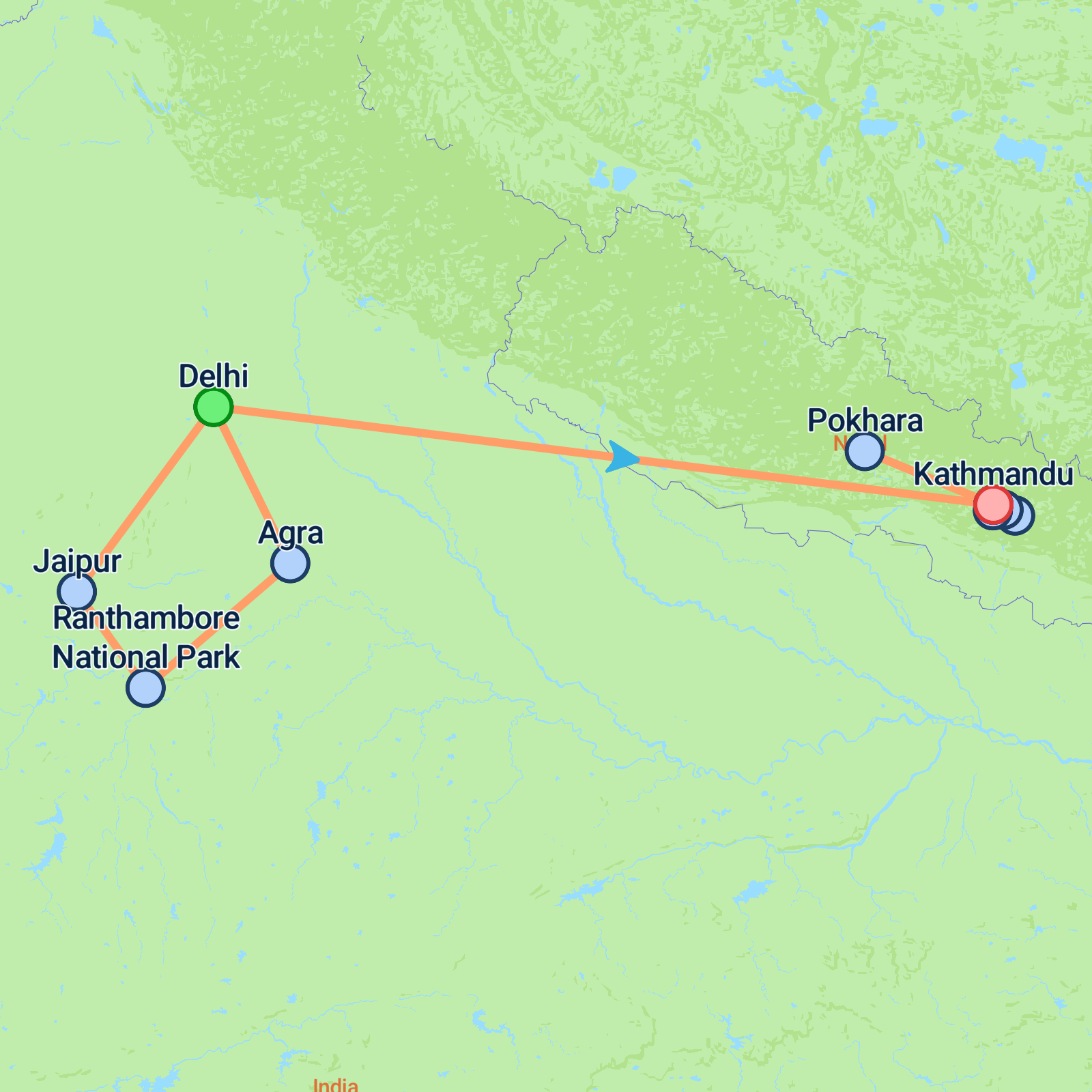 Embark on a remarkable 16-day group tour from Delhi to Kathmandu. Begin in Delhi before travelling to Agra for sunset at the Taj Mahal and tiger safaris in Ranthambore. Continue to Jaipur, the colourful Pink City, before returning to the capital for your flight to Kathmandu. In Nepal, take in Himalayan panoramas from Dhulikhel, explore Kathmandu’s temples, and wander through medieval Bhaktapur and artistic Patan. The final stop is Pokhara, with boat rides, scenic hikes and crisp Himalayan air before you return to Kathmandu.