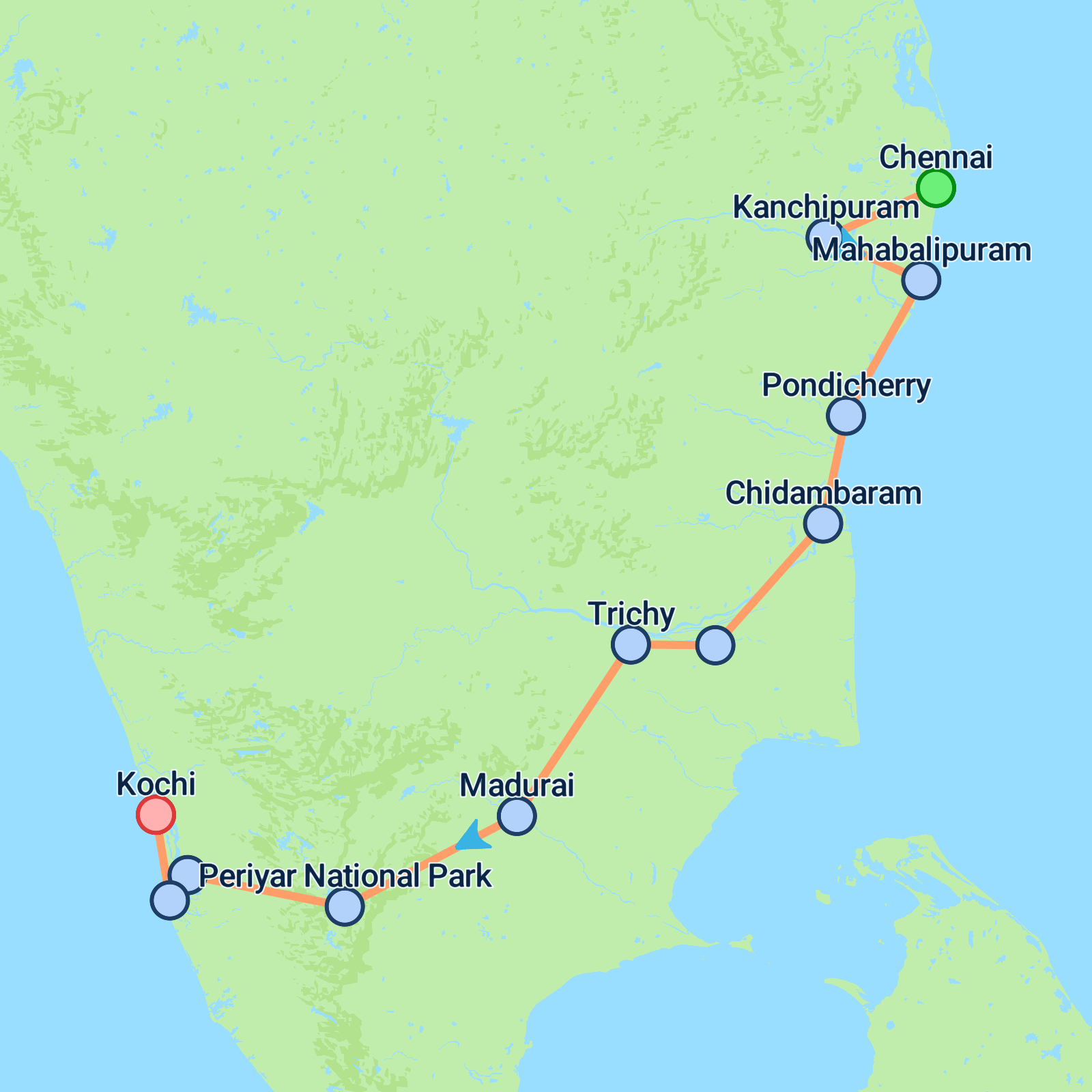 PRIVATE TOUR: Set off on a 12-day tour from Chennai to Kochi. Explore Chennai’s historic quarters before visiting the famed temples of Kanchipuram and Mahabalipuram. Continue to Pondicherry’s French-influenced streets, then journey through Chidambaram, Tanjore, Trichy and Madurai for impressive architecture and vibrant traditions. Move into the cool greenery of Periyar for wildlife viewing, then unwind on Alleppey’s tranquil backwaters aboard a traditional houseboat. Finish in Kochi, where heritage buildings, spice-scented markets and local arts offer a fitting end to the journey.