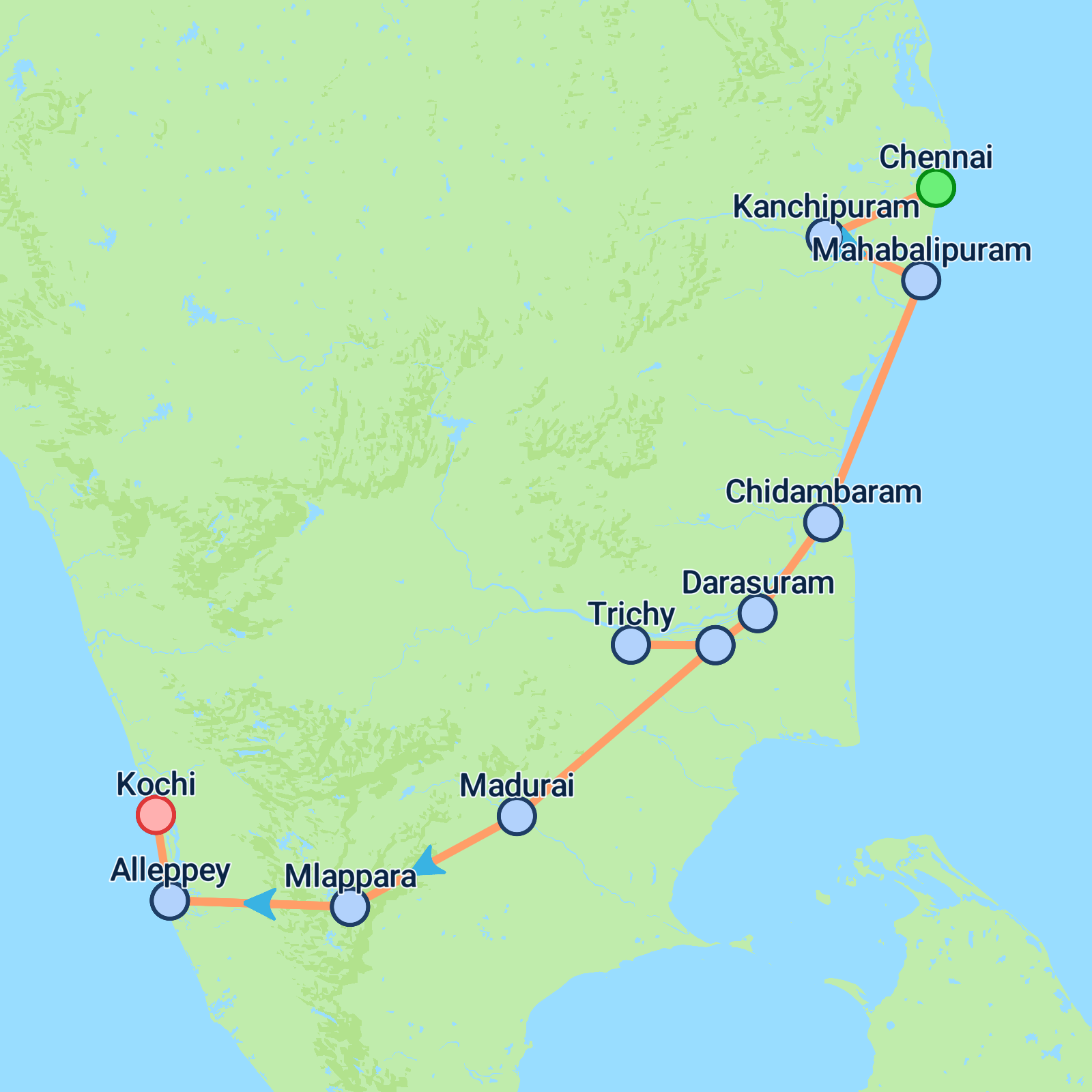 This 11-day tour begins in Chennai and finishes in Kochi, offering a rich blend of history, culture, and nature. Youll explore Chennais colonial heritage and vibrant temples before heading to Mahabalipuram and Thanjavur to admire ancient temples and silk weaving traditions. The journey continues to Madurais colourful Meenakshi Temple and the wildlife sanctuary of Periyar, where a boat ride reveals elephants and other exotic animals. Experience the serene backwaters of Alleppey aboard a traditional houseboat, then finish with a leisurely couple of days in Kochi, discovering its historic Jewish Quarter, Dutch Palace, and bustling streets at your own pace.