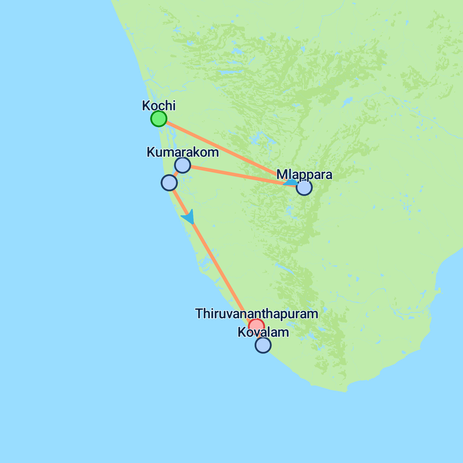 This 7-day tour starts in Kochi and finishes in Kovalam, offering a fantastic blend of culture, nature and relaxation. Youll explore Kochis charming colonial streets and historic sites before heading to Periyar to enjoy a wildlife boat ride amid elephants and exotic animals. Next, discover the tranquil backwaters of Kumarakom and spend a night aboard a traditional houseboat, soaking in the serene scenery. The tour ends with two leisurely days in Kovalam, where you can unwind on beautiful beaches, try local cuisine or indulge in Ayurvedic treatments. Its a perfect mix of adventure and downtime along Keralas stunning coast.