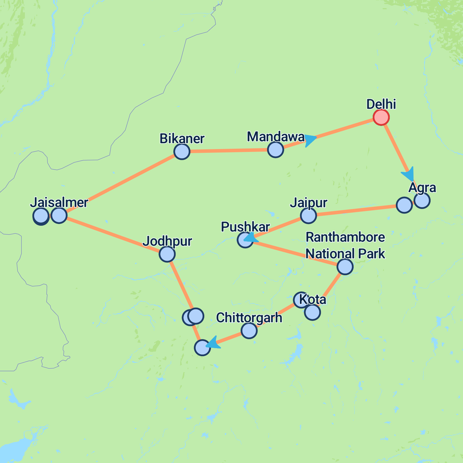 PRIVATE TOUR: Discover India on this 21-day tour starting and ending in Delhi, taking in a showcase of Rajasthan’s culture, history and landscapes. The journey begins with the landmarks of the capital before moving to Agra for the Taj Mahal and on to Jaipur for its grand forts and palaces. Pushkar’s sacred sites and the wildlife of Ranthambore add contrast, followed by the heritage of Kota, Bundi and Chittorgarh. Udaipur’s lakeside scenery and Kumbhalgarh’s hilltop stronghold led to Jodhpur’s blue city, Jaisalmer’s golden fort and desert dunes, Bikaner’s desert character and Mandawa’s painted havelis before the final return to Delhi.