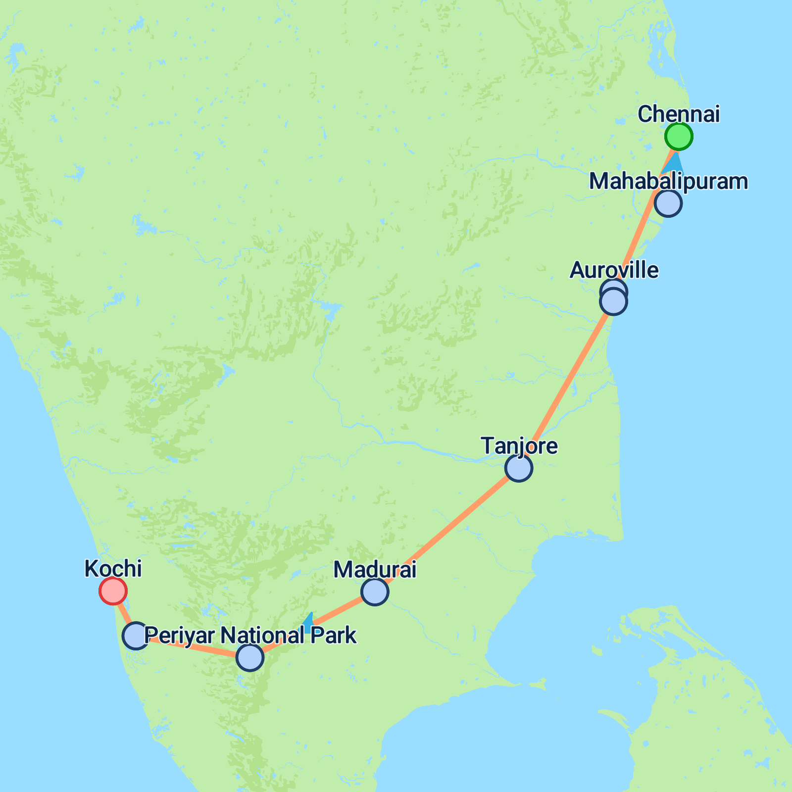 Journey through southern India on this 11-day journey from Chennai to Kochi. Begin by exploring Mahabalipuram’s coastal temples before travelling through the former French enclave of Pondicherry and the temple city of Tanjore. Discover ancient artistry, colourful markets, and lively rituals in Madurai, then head to Periyar National Park to learn about spices and local wildlife. Relax along the tranquil Kerala backwaters in Kumarakom, and round off your adventure in Kochi, where colonial charm meets modern India.