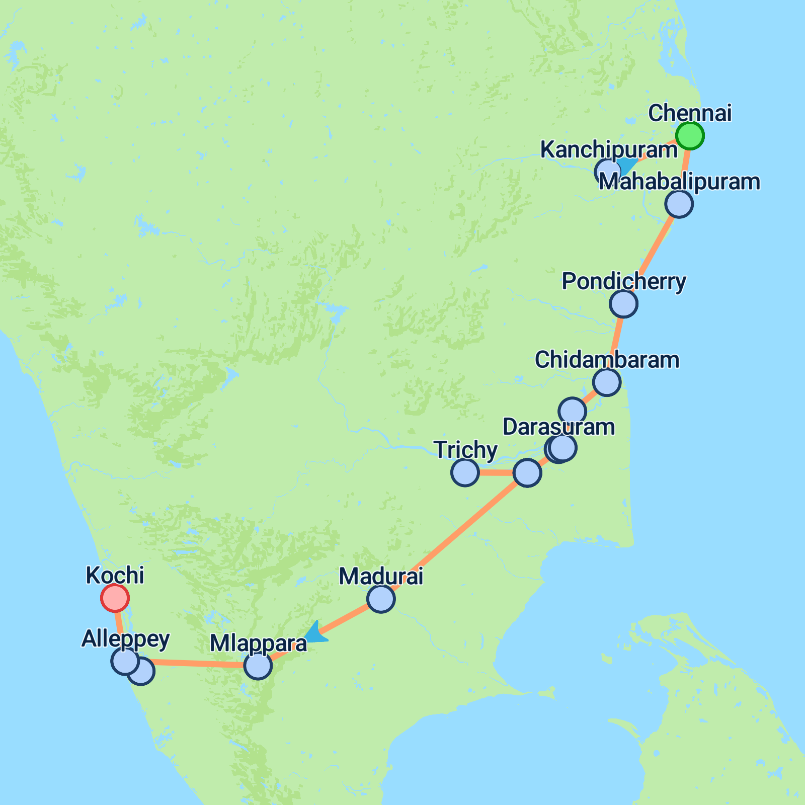 This 11-day tour begins in Chennai and finishes in Kochi, offering a rich journey through South Indias cultural and natural gems. Youll explore ancient temples in Kanchipuram, Mahabalipuram and Kumbakonam, soak up the French charm of Pondicherry, and visit historic cities like Tanjore and Madurai. Highlights include a boat ride on Periyar Lake to spot wildlife, a night ceremony at the Meenakshi Temple, and a relaxing houseboat cruise along Keralas tranquil backwaters. The tour blends vibrant heritage, stunning architecture and serene landscapes, giving you a wonderful taste of Indias diverse traditions and scenic beauty.