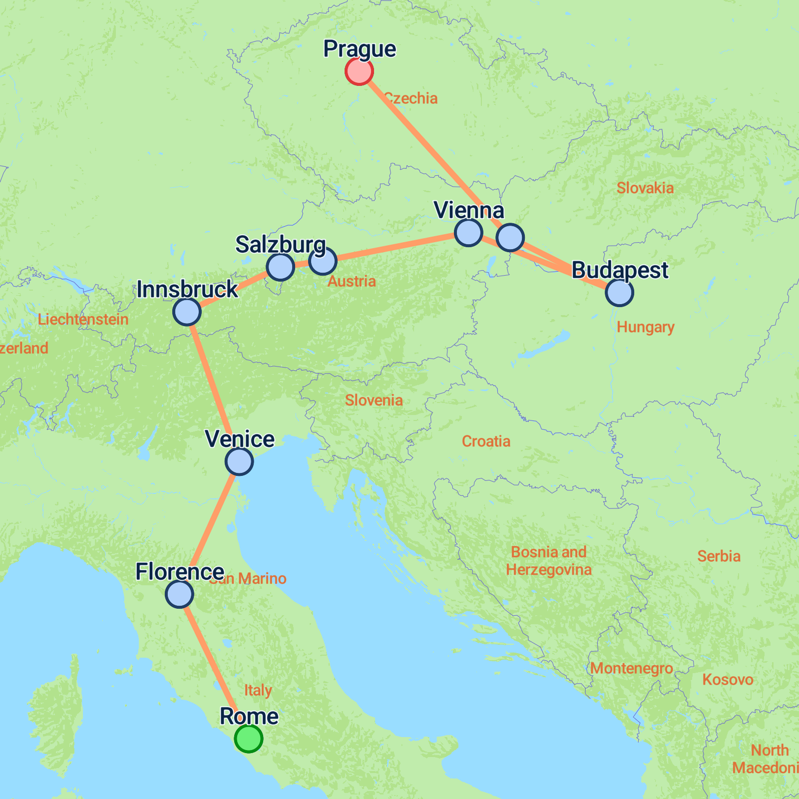 Embark on an 11-day adventure starting in the historic city of Rome and concluding in the cultural gem of Prague. Begin by exploring Rome's iconic sites like the Colosseum and Vatican City, before heading north to Florence for breathtaking views and a taste of its open-air museum charm. Discover Venices canals and famous glass factories, then cross the border to Austria, where you'll visit Innsbruck and Salzburg, Mozarts picturesque city. Marvel at the landscapes of St. Wolfgang and Traunsee Lake. In Vienna, enjoy grand avenues and palaces, then take a Danube River cruise in Budapest. Finish in Prague, exploring its stunning Baroque sights and vibrant atmosphere. This tour promises a captivating mix of history, culture, and breathtaking scenery.