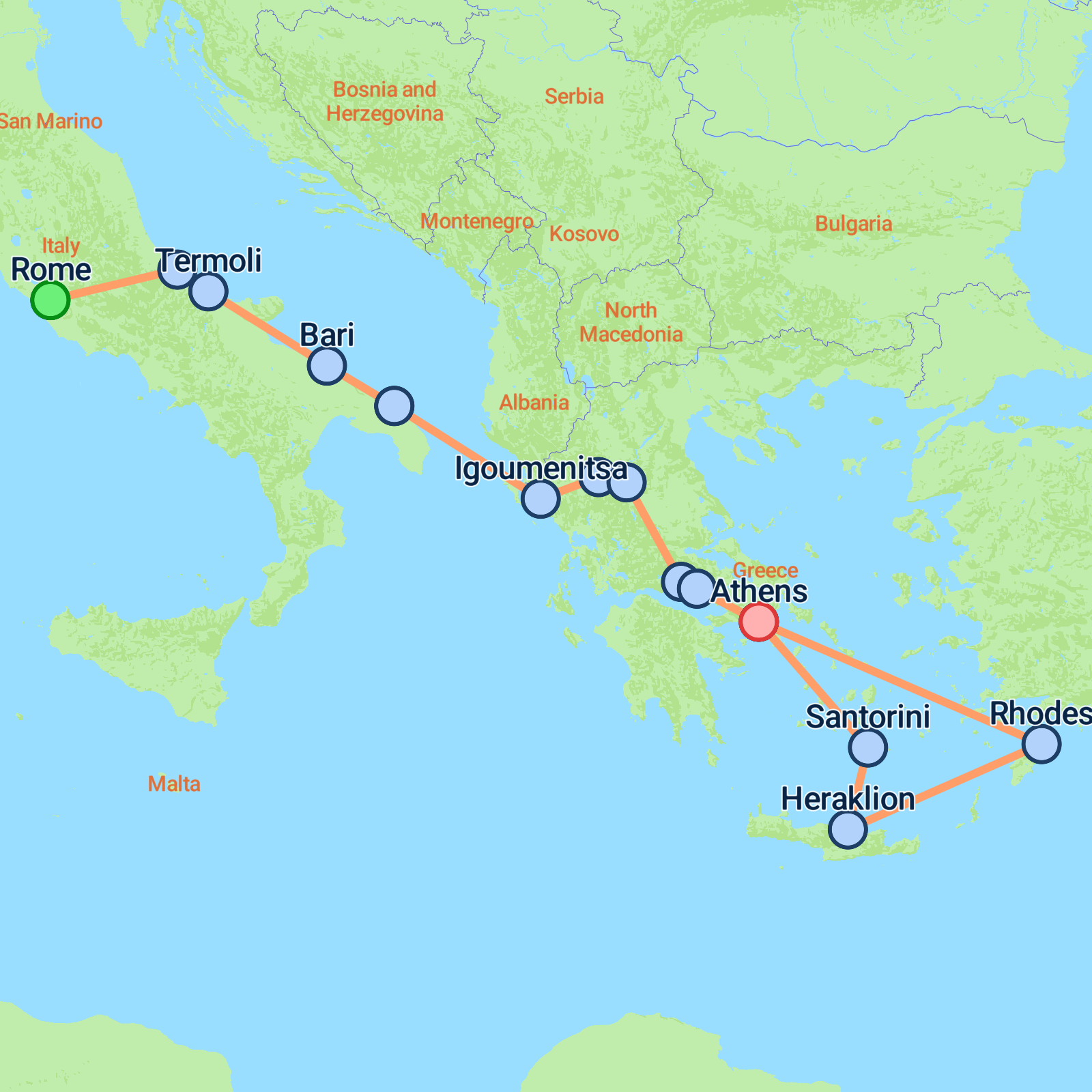 Join us on an unforgettable 16-day journey starting in the historic city of Rome and ending in the vibrant city of Athens. In Rome, you'll embrace the grandeur of ancient landmarks and savour its captivating atmosphere. Travelling through Italy, you'll visit charming coastal towns before crossing the Ionian Sea to Greece. Discover the stunning Meteora monasteries, explore Delphis ancient treasures, and experience the cultural richness of Athens. Sail to the idyllic Greek islands of Rhodes and Crete, with their stunning landscapes and historic sites, and end your trip soaking in Santorini's breathtaking views. Expect a mix of cultural exploration, stunning scenery, and delightful Mediterranean flavours.