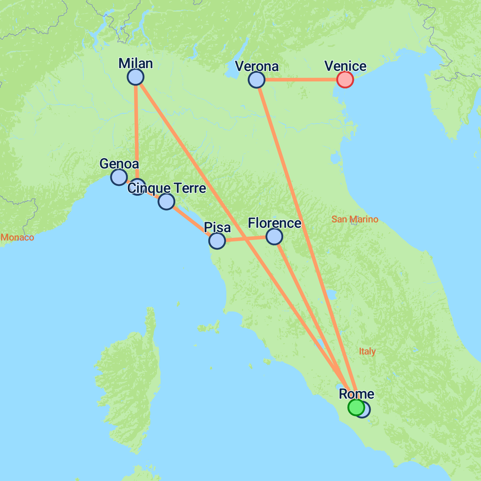 Set off on a captivating nine-day Italian adventure from the historic streets of Rome to the enchanting canals of Venice. Begin in Rome with a guided tour of its iconic landmarks like the Colosseum and the majestic Vatican City. You'll then journey north to awe-inspiring Florence, explore the Leaning Tower of Pisa, and be mesmerised by the breathtaking landscapes of Cinque Terre. Soak up the elegant charm of Portofino before heading to stylish Milan. Delight in the scenic beauty of Italy's Lakes Region and the romantic allure of Verona. Your trip concludes in Venice, where you can enjoy a gondola ride and experience the charm of St. Mark's Square.