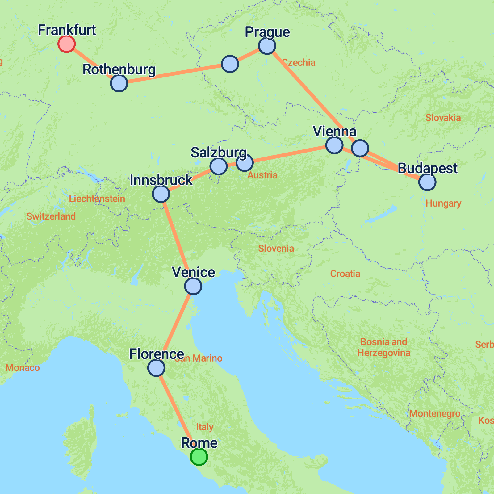 Start your unforgettable 12-day journey in Rome, where you'll dive into history with panoramic tours of ancient sites like the Colosseum and Vatican City. Heading north to Florence, take in the breathtaking cityscape from Piazzale Michelangelo and explore iconic landmarks such as Ponte Vecchio. In Venice, revel in the charm of St. Marks Square and marvel at glassmaking on Murano Island. As you hop from Austria to Hungary, traverse beautiful passages like the Austrian lakes and the Danube River in Budapest. Experience the romantic aura of Prague, followed by Germanys picturesque fairytale towns. Your adventure wraps up in Frankfurt amidst lush scenery and rich history.