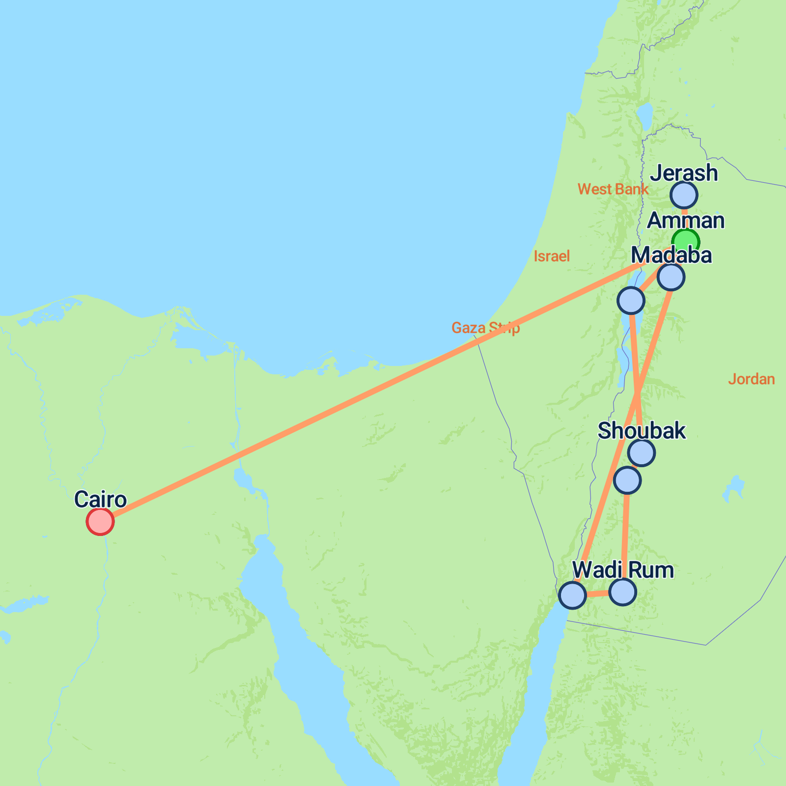 Set out on a captivating 10-day journey from Amman to Cairo, where history and natural beauty come together in perfect harmony. This tour kicks off in Amman, exploring the remarkable AJLUN FORTRESS and the ancient treasures of JERASH. The adventure continues with visits to the stunning Madaba mosaics and the biblical heights of Mount Nebo. Experience a piece of history in Bethany and float effortlessly on the Dead Sea's surface. Petra's spectacular rock-carved wonders will leave you in awe, while Wadi Rum's dramatic desert landscapes offer a taste of Bedouin life. Conclude your trip with Cairo's iconic Pyramids and the treasures of the Egyptian Museum. An unforgettable journey awaits!