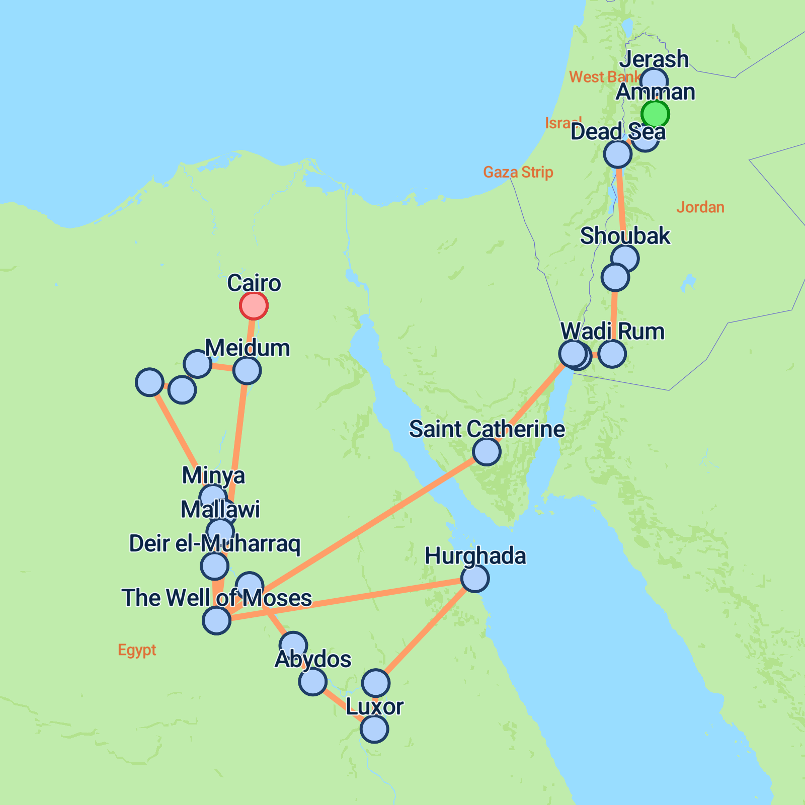 Embark on a fascinating 17-day journey from Amman to Cairo, exploring the diverse wonders of Jordan and Egypt. Begin in Amman, discovering historical landmarks like the Ajlun Fortress and Jerash's Roman ruins. Dive into the rich culture of Petra and enjoy a thrilling camel ride in Wadi Rum's iconic desert. Relish the unique experience of floating in the Dead Sea before crossing borders into the vibrant Red Sea city of Eilat. In Egypt, the awe-inspiring Pyramids of Giza beckon, while Luxor offers an intimate glimpse into ancient civilisations. Conclude at the serene resort town of Hurghada, nestled by the Red Sea.