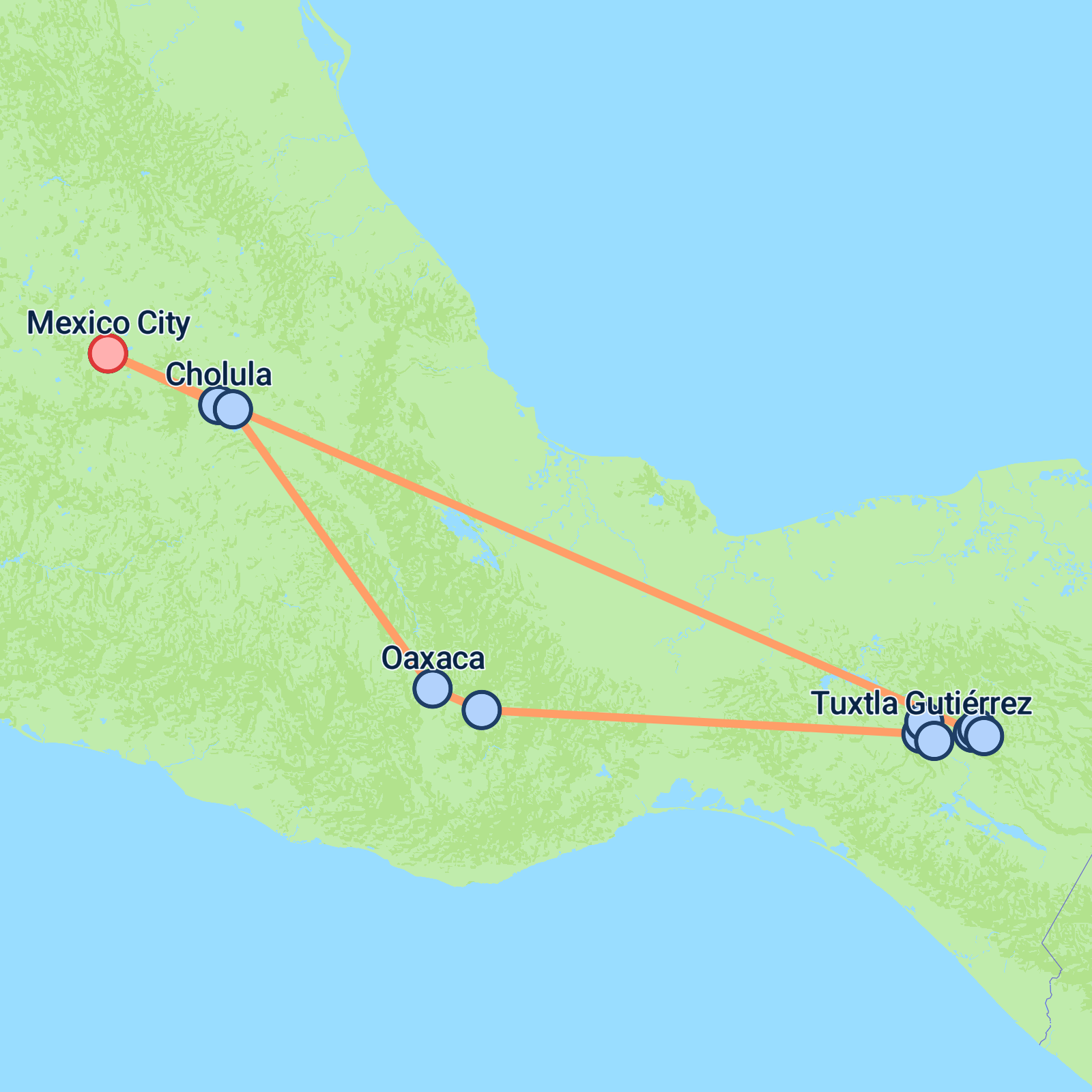 Begin your adventure in vibrant Mexico City and explore over 8 days, ending back in the bustling capital. Start by soaking up the historic charm of Mexico City, from the bustling Zcalo to the serene canals of Xochimilco. Marvel at the vast expanse of the Basilica of Guadalupe and enjoy a taste of local life at Plaza de Garibaldi. Wander through the cobblestone streets of Cholula and Puebla, cities rich in colonial history and captivating architecture. Continue towards majestic Oaxaca, with a visit to the remarkable ruins of Monte Albn. Experience the awe-inspiring Sumidero Canyon and the cultural richness of Chiapa de Corzo. Wrap up with a journey through the highlands of San Cristbal de las Casas. An unforgettable journey full of colour and culture awaits.