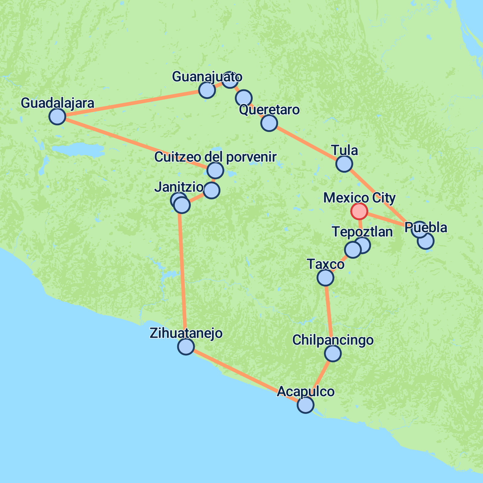 Begin your adventure in the vibrant Mexico City, and over 12 days, explore a tapestry of Mexicos historical and cultural gems. Dive into the archaeological wonders of Teotihuacan and the rich traditions of Tepoztlan. Visit iconic locations like Taxcos cobbled streets and explore Acapulcos stunning coastline. Experience the natural beauty of Zihuatanejo and immerse yourself in the authentic Purpecha culture at Lake Ptzcuaro. Discover Morelias UNESCO-listed architecture before indulging in the spirited atmosphere of Guadalajara, birthplace of Mariachi and Tequila. As your journey concludes back in Mexico City, savour the vibrant culture, historical intrigue, and diverse landscapes Mexico has to offer.