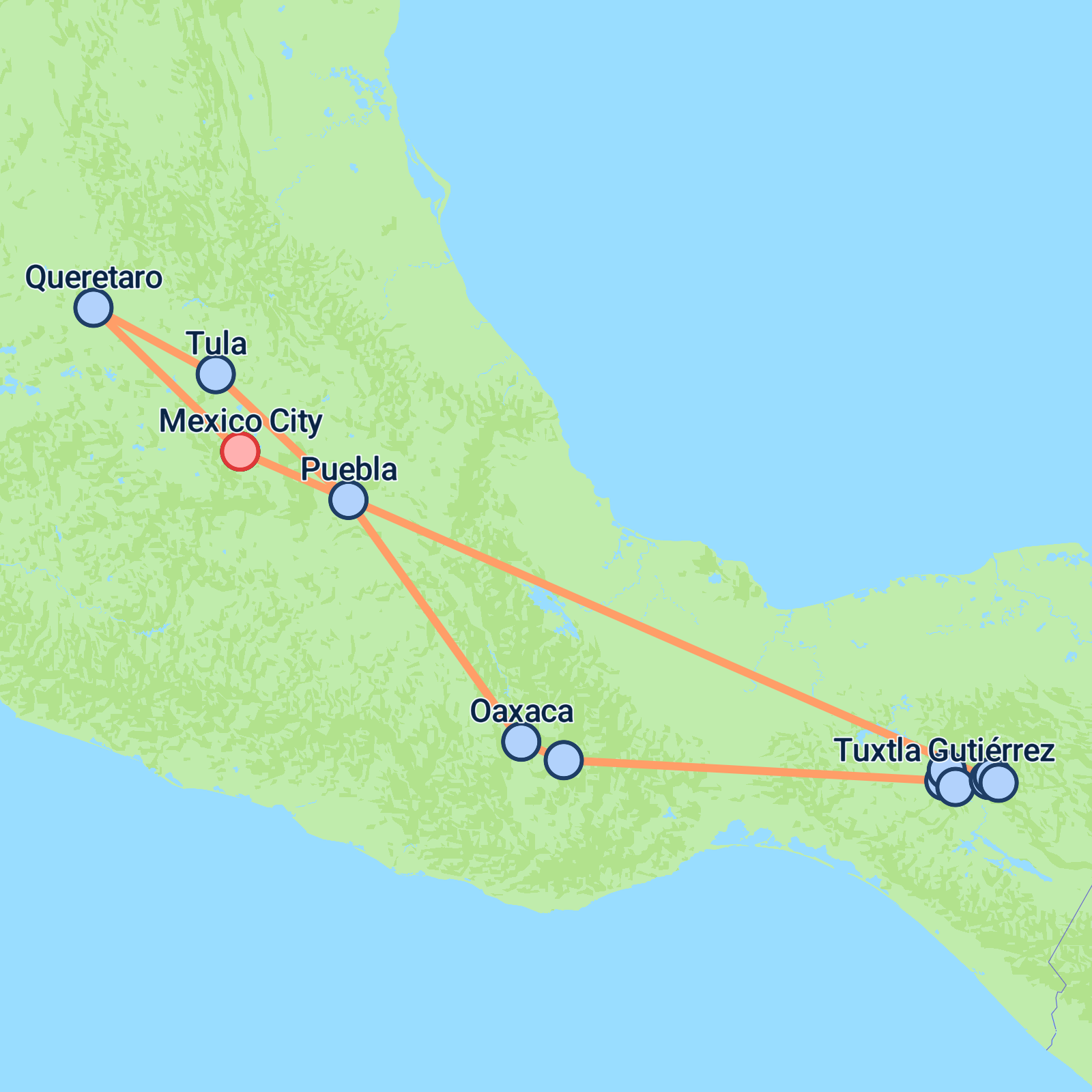 Embark on a 10-day Mexican adventure starting and concluding in bustling Mexico City. Dive into the capitals vibrant culture before exploring Teotihuacans iconic pyramids. Wander through the historic streets of Queretaro and savour wine and cheese in San Patricio and Bernal. Head to Tula to marvel at the ancient Toltec monuments, then relish Pueblas culinary wonders. Venture to Oaxaca, rich in Aztec legacy, and ascend Monte Albn for breathtaking views. Meander through the charming streets of Mitla, and take a thrilling boat ride through the Sumidero Canyon. Finally, immerse yourself in the traditions of Chiapa de Corzo, Zinacantan, and San Juan Chamula. Adventure awaits!