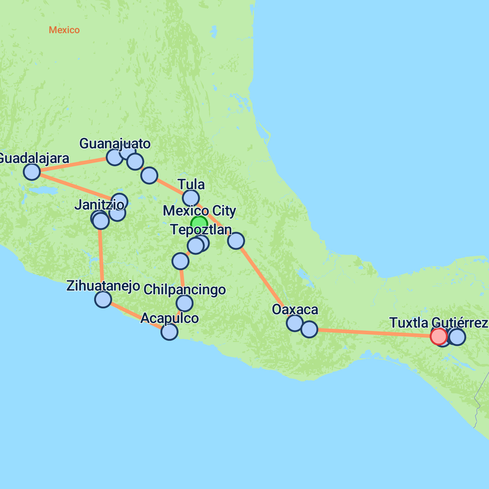 Embark on a 17-day adventure from the bustling Mexico City to the vibrant streets of Tuxtla Gutirrez. Youll explore the ancient pyramids of Teotihuacan, stroll through the charming colonial towns of Cuernavaca and Taxco, and relax on Acapulco's stunning beaches. Dive into Mexican culture with visits to the artisan markets of Patzcuaro and the Tequila distilleries of Jalisco. Discover the UNESCO World Heritage sites of Morelia and Guanajuato before heading to Oaxaca's historic Monte Albn. The tour wraps up with a breathtaking boat trip through Sumidero Canyon and an exploration of San Cristbal de las Casas, offering a true taste of Mexicos rich diversity.