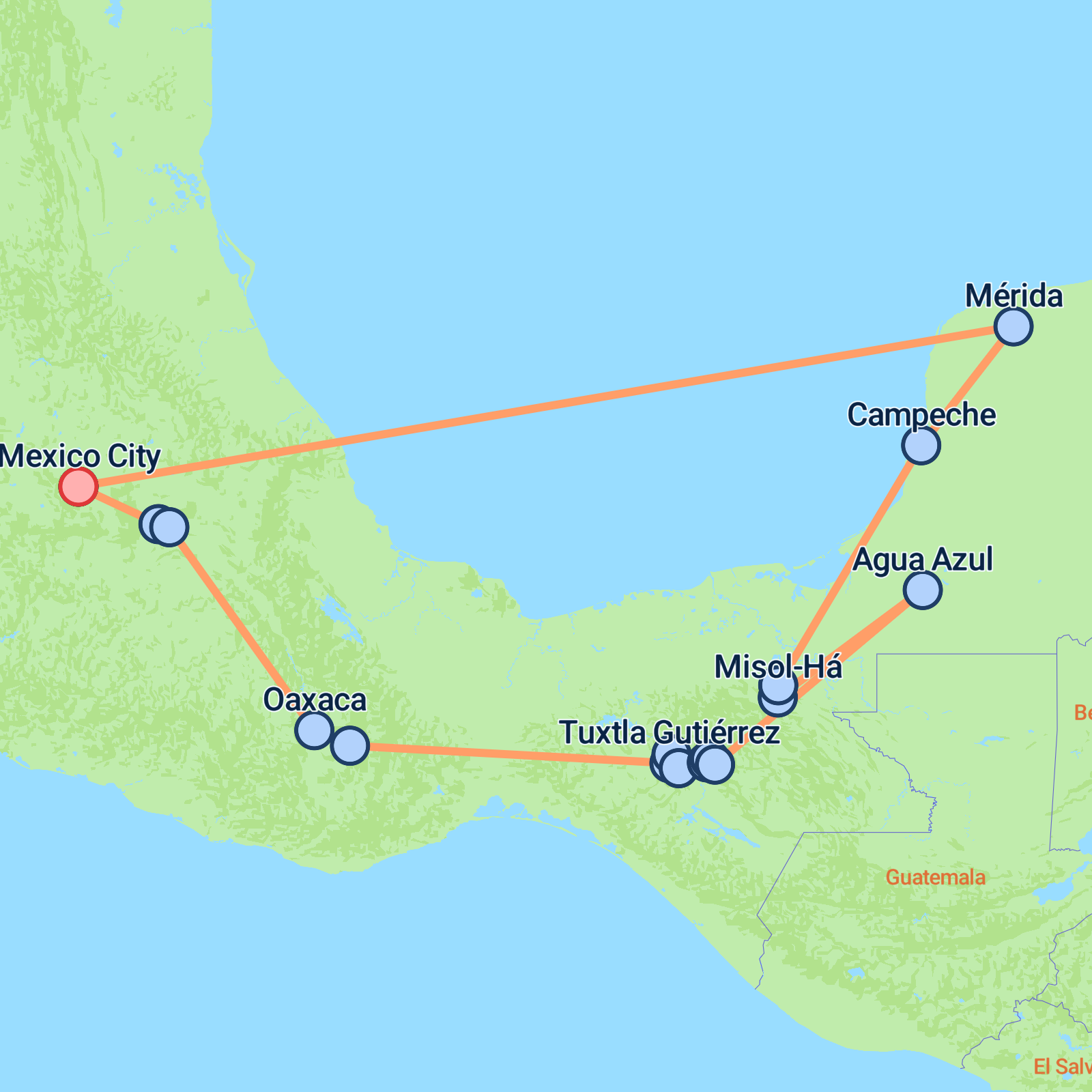 Embark on an exciting 11-day journey that kicks off and wraps up in the vibrant metropolis of Mexico City. This tour takes you through Mexico's diverse landscapes and rich cultural tapestry. Start by exploring Mexico City's bustling heart, its iconic Zcalo, and the enchanting Xochimilco canals. Then, journey through Pueblas colonial streets and Oaxacas ancient Zapotec sites atop Monte Albn, soaking up history at each turn. Experience Chiapas' natural beauty, from Sumidero Canyon to the serene Agua Azul waterfalls. Discover the splendid ruins of Palenque, then traverse to Campeche's fortified coastline and Mrida's blend of Maya and colonial elegance. This adventure promises a kaleidoscope of experiences and unforgettable moments.