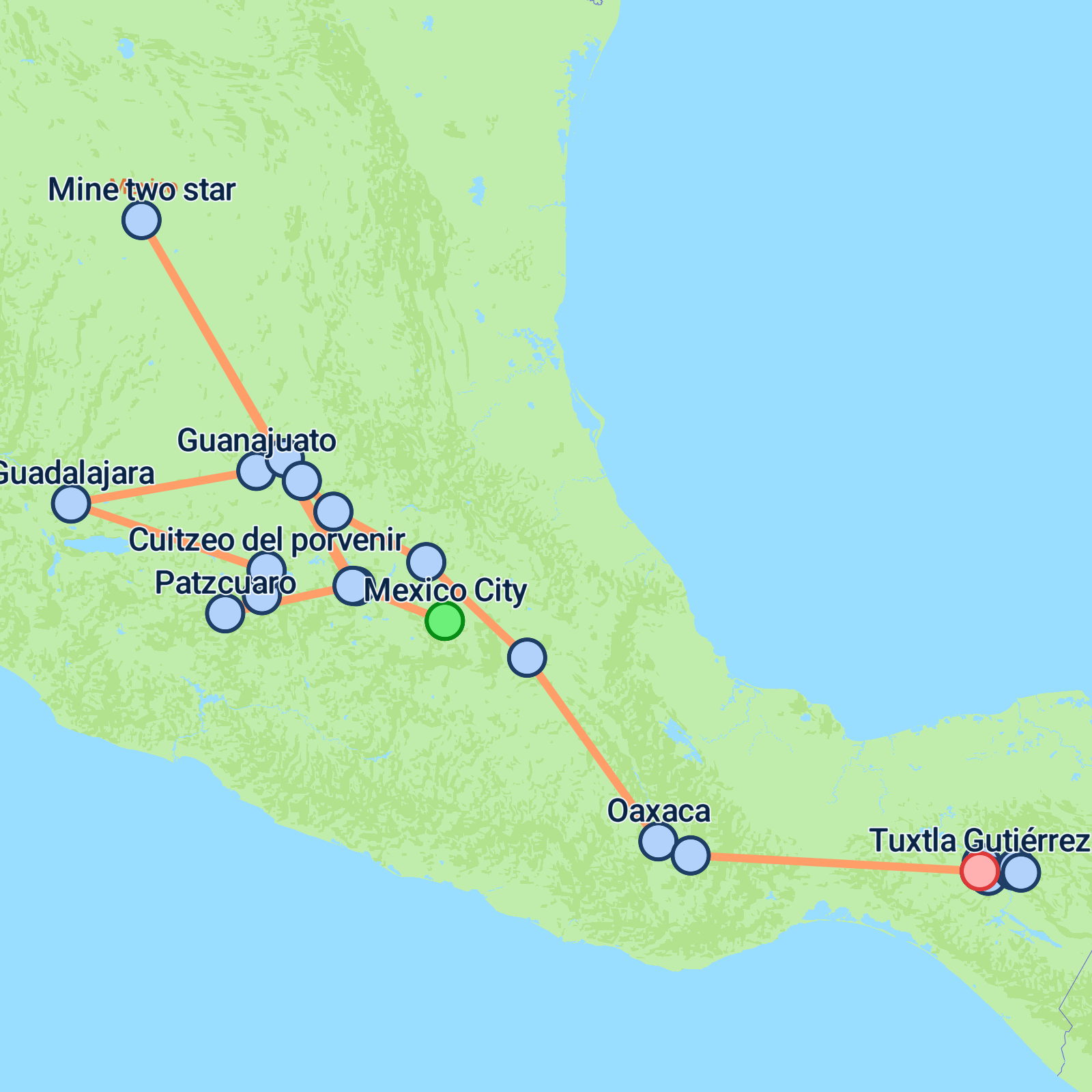 Embark on a captivating 14-day adventure from Mexico City to Tuxtla Gutirrez, uncovering the diverse wonders of Mexico. Start your journey exploring Mexico Citys iconic Zcalo and the vibrant Xochimilco before heading to picturesque Pueblos Mgicos like El Oro de Hidalgo and Tlalpujahua. Discover the majestic architecture of Morelia and the festive spirit of Guadalajara. In Guanajuato, wander through charming colonial streets before delving into Mexicos rich history at Tula's ancient ruins. Marvel at Oaxacas Zapotec legacy and experience Chiapass breathtaking natural beauty, including the dramatic Sumidero Canyon. This tour offers a perfect blend of cultural treasures, stunning landscapes, and unforgettable experiences.