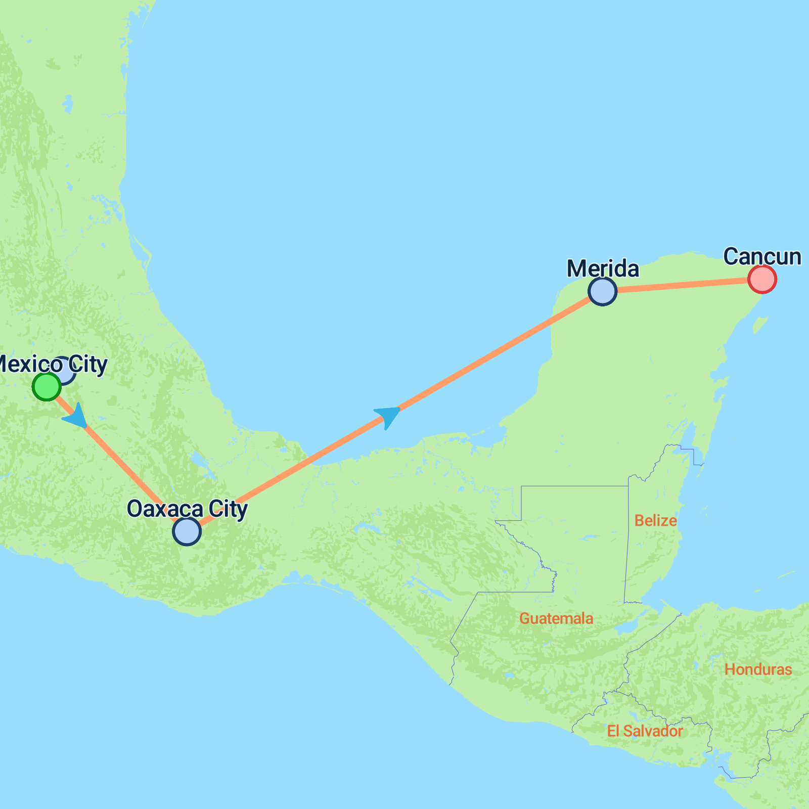 This 12-day tour begins in Mexico City and finishes in Playa del Carmen, offering a rich blend of history, culture and natural beauty. Youll explore Mexico Citys vibrant historic centre, cruise the colourful canals of Xochimilco, and visit the impressive Teotihuacan pyramids. Then its on to Oaxaca, where youll discover ancient Zapotec ruins, traditional crafts and lively markets. The journey continues to Mrida with a hands-on cooking class, refreshing cenote visits and the fascinating Mayan site of Uxmal. Finally, youll experience the awe-inspiring Chichen Itza before heading to the stunning Riviera Maya coast. A fantastic mix of city life, archaeology and local flavours awaits.