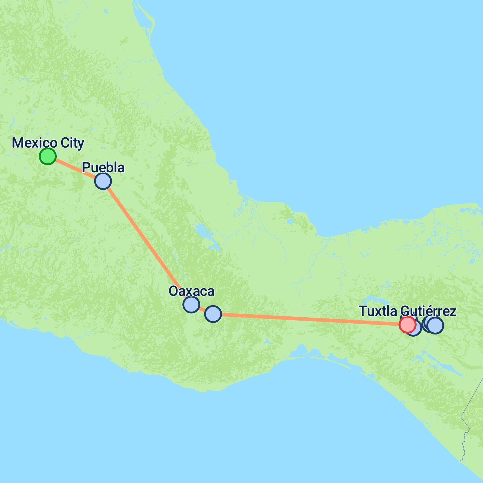 Set off from vibrant Mexico City on an 11-day adventure through the heart of Mexico, wrapping up in Tuxtla Gutirrez. Begin by exploring Mexico City's historical sites before venturing out to the awe-inspiring pyramids of Teotihuacn. Experience the colonial charm and vibrant culture of Puebla, with highlights including Cholulas Great Pyramid and a cheese tasting in Chipilo. Journey on to Oaxaca, famed for its UNESCO-listed historic centre and the magnificent ancient site of Monte Albn. In Chiapas, sail through the stunning Sumidero Canyon and delve into the rich Mayan heritage at San Juan Chamula. Embrace outdoor adventures and cultural immersion in San Cristobal de las Casas before your tour comes to an end.