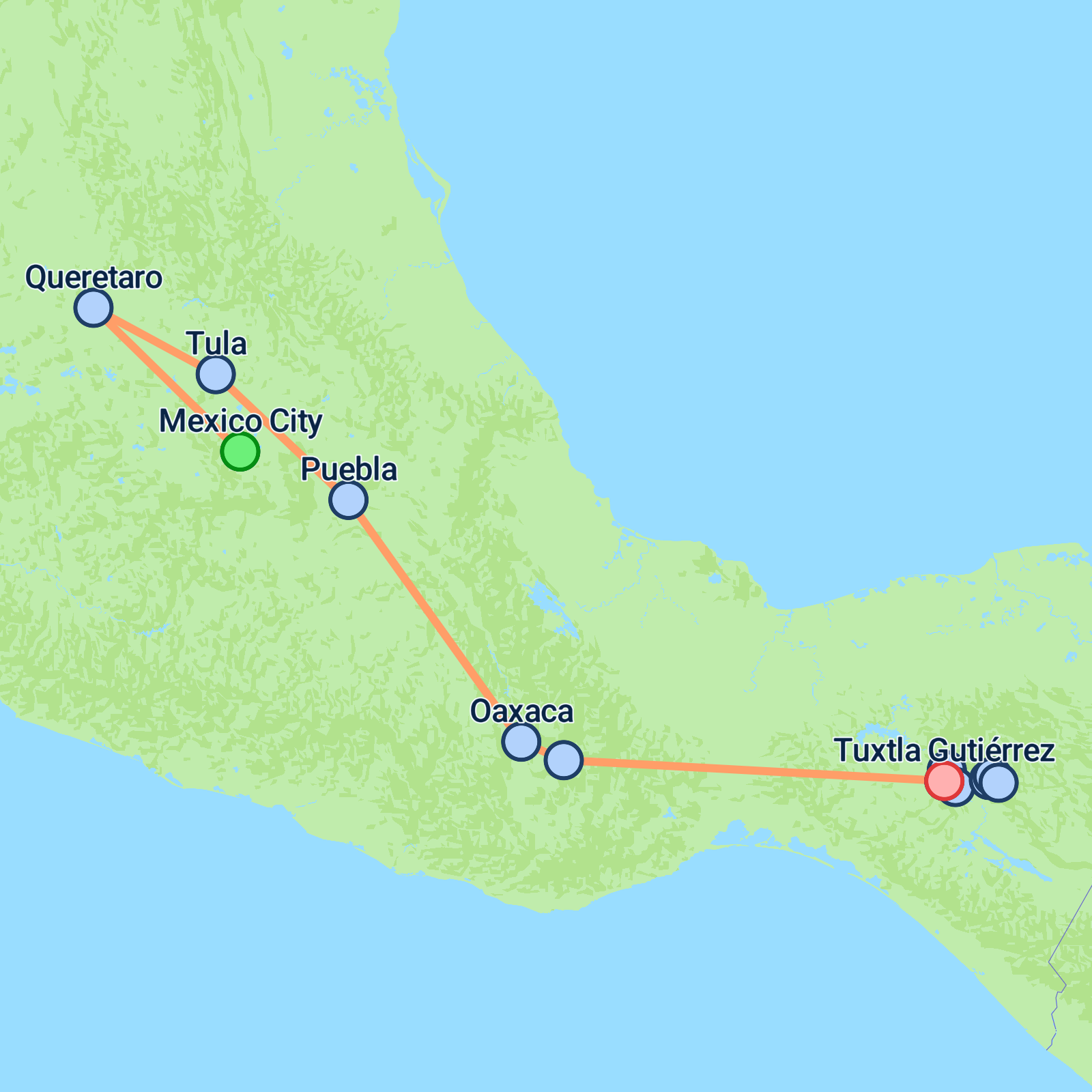 Kick off an incredible 12-day journey in vibrant Mexico City and wind up in Tuxtla Gutirrez. Immerse yourself in the pulsating heart of Mexican culture with trips to the impressive Teotihuacan Pyramids and the Basilica of Our Lady of Guadalupe. Discover Queretaro's coffee-strewn lanes and sample exquisite local wines and cheeses. Enjoy breathtaking views of Monte Albn and delve into the vibrant streets of Oaxaca. Journey through crafted colonial towns like Puebla and San Cristobal de las Casas, where ancient Mayan traditions and healing practices come alive. Sumidero Canyons sheer cliffs and the magic of Zinacantn's colourful fabrics await. Finish with a relaxing ride to the airport in Tuxtla Gutirrez. A truly captivating adventure not to be missed!