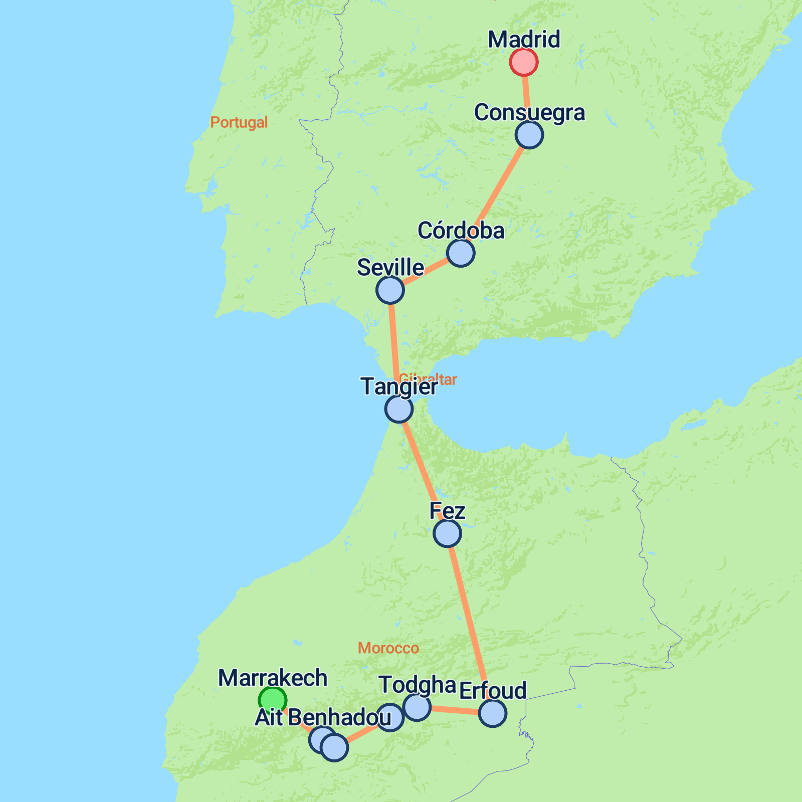 Begin your adventure in the vibrant city of Marrakech, the gateway to a 10-day Moroccan and Spanish journey that ultimately concludes in the bustling capital of Spain, Madrid. Immerse yourself in the bustling Jemaa el-Fnaa square and wander through Marrakech's enchanting Medina. Cross the dramatic Atlas Mountains and discover the cinematic charm of Ait Benhaddou and the rugged beauty of Todgha Gorge. Explore the heritage-rich streets of Fez and the coastal vistas of Tangier before crossing the sea to Spain. Delight in Sevilles rich history and stunning architecture before visiting Cordobas iconic MosqueCathedral and Consuegras windmills, creating unforgettable memories along the way.