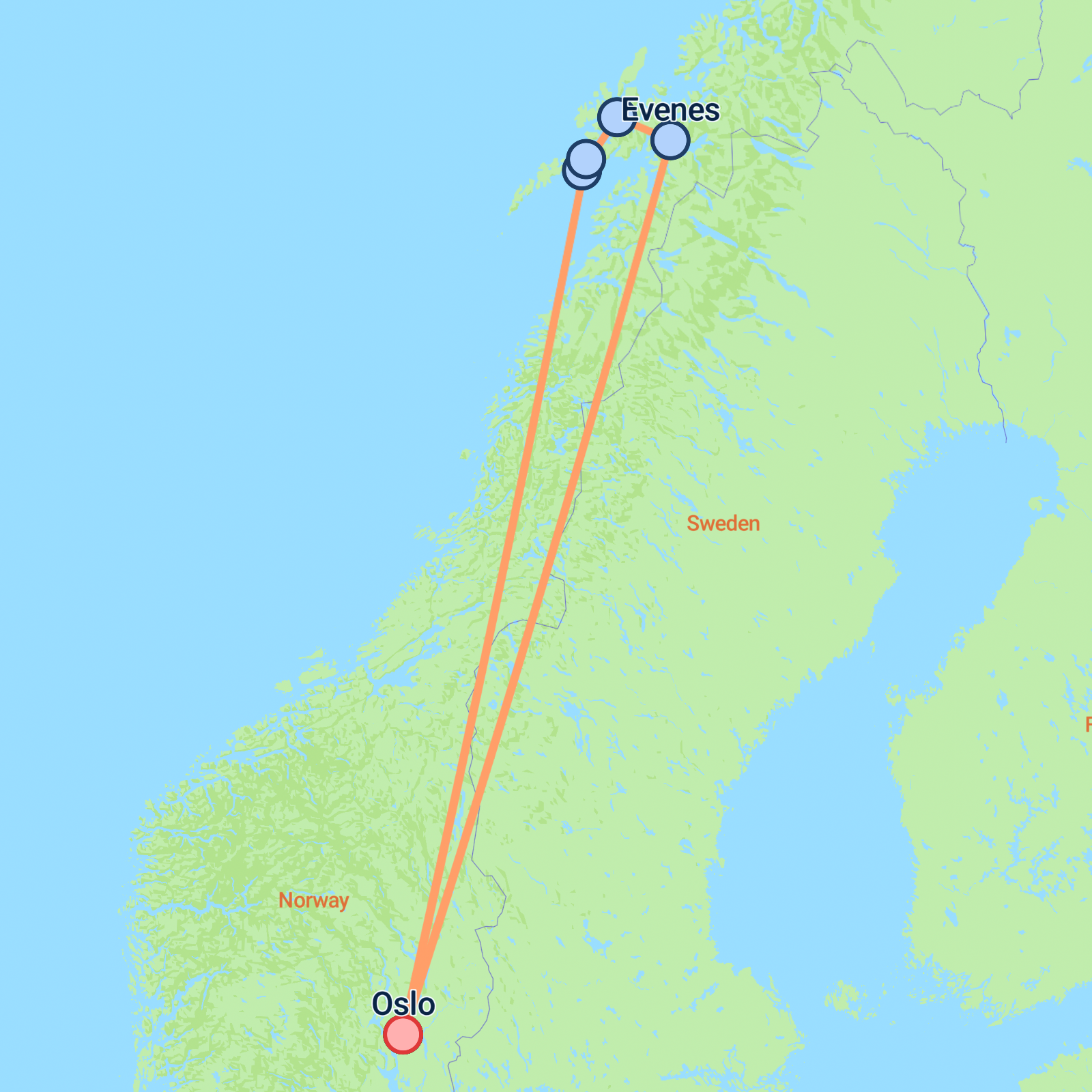 Our late-afternoon flight departs Evenes at 17:15, arriving in Oslo at 19:00. From the terminal, it’s an easy walk to your hotel.