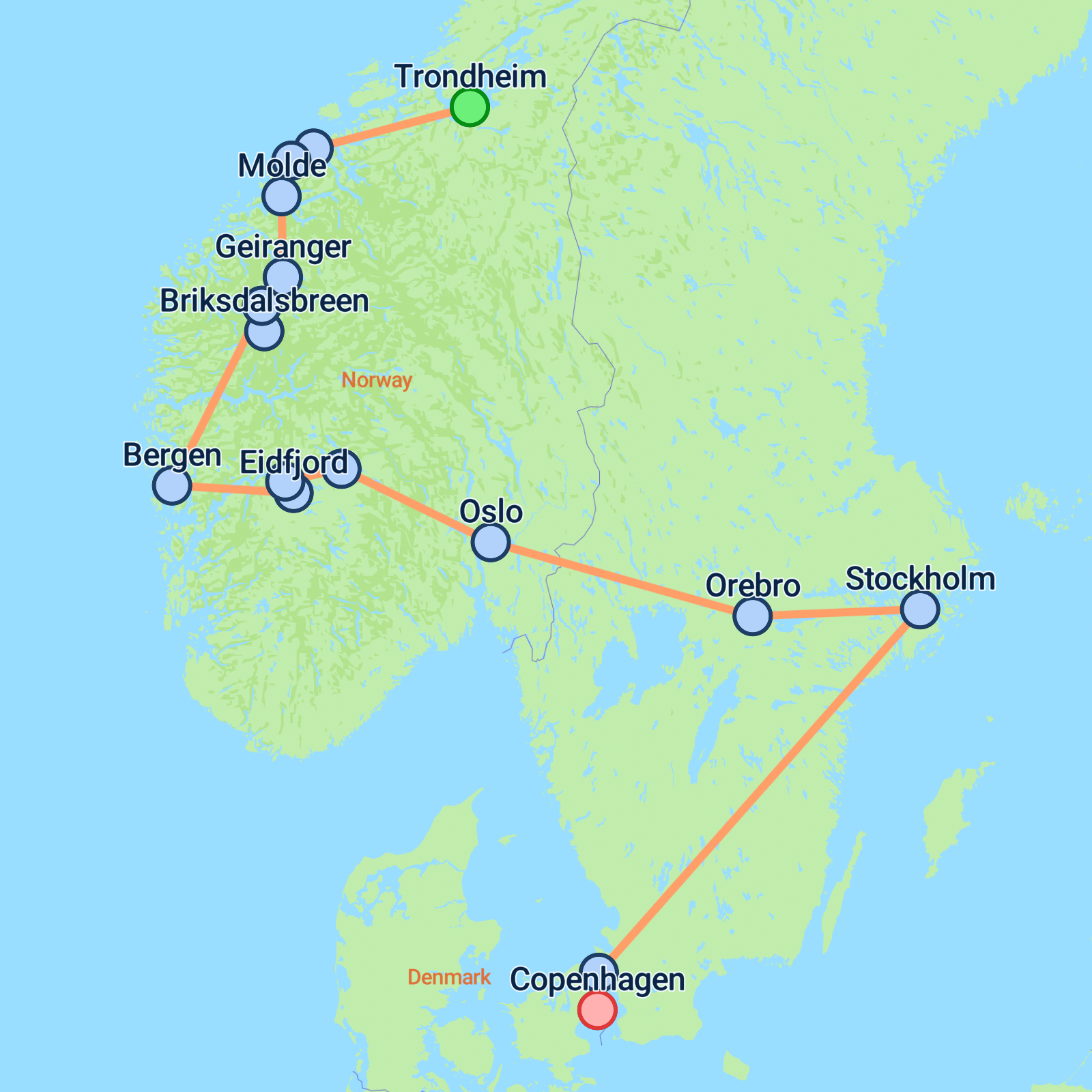 Embark on a captivating 10-day adventure starting in Trondheim and concluding in the vibrant city of Copenhagen. From the stunning Norwegian coastline to iconic fjords, you'll experience breathtaking natural scenery and charming towns. Highlights include the famed Atlantic Road, the awe-inspiring Geiranger and Briksdalsbreen, and the historic city of Bergen. Discover Norway's most spectacular waterfall in Eidfjord and explore Oslo's vibrant architecture. As you cross into Sweden, savour the charm of rebro and the beauty of Stockholm's islands. Finally, immerse yourself in Danish culture with visits to Helsingr and Copenhagen. Expect a blend of stunning landscapes, rich history, and vibrant city life.