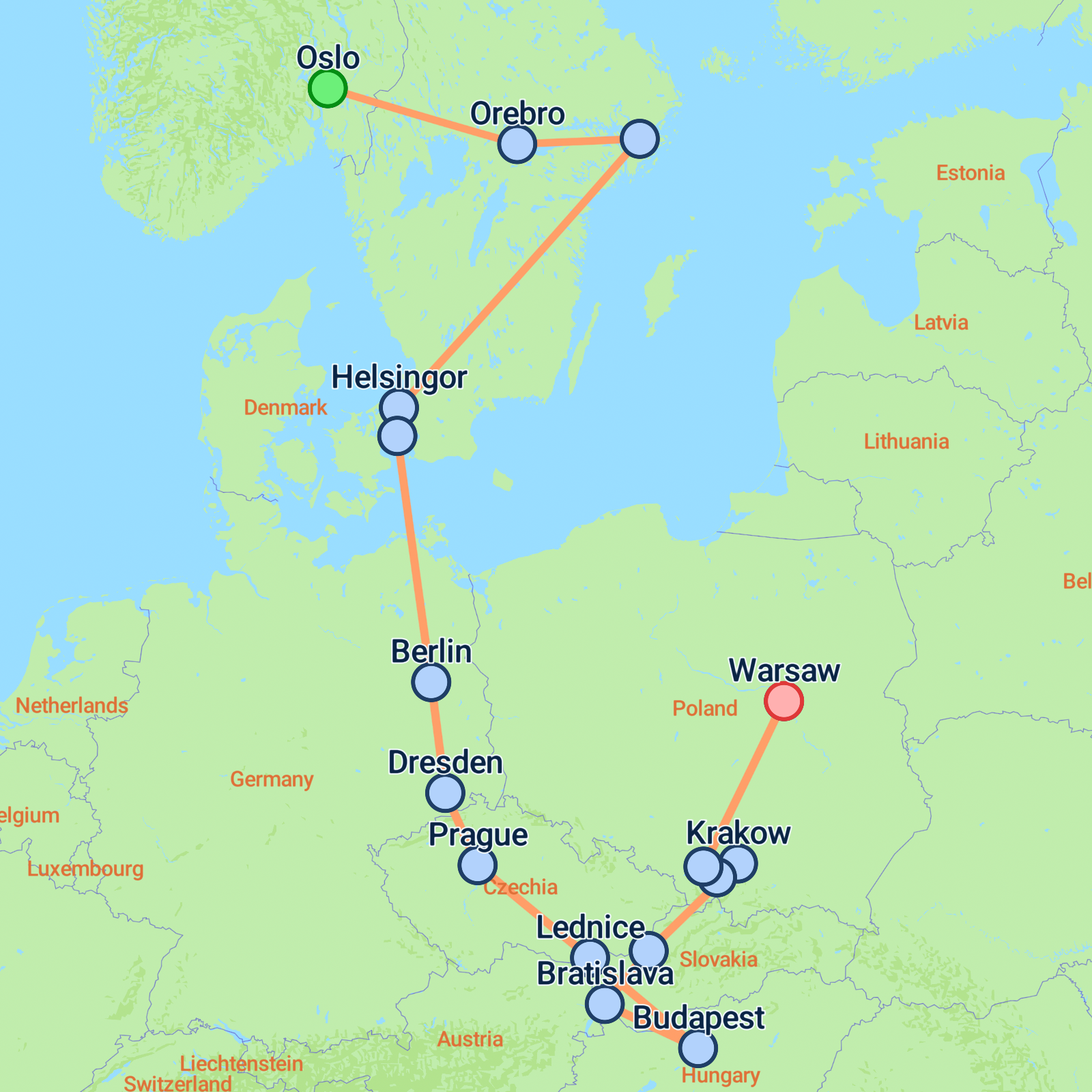 Embark on an exciting 14-day adventure from Oslo to Warsaw, diving deep into Northern and Central Europes charms. Begin with Oslos vibrant mix of modernity and classic elegance. Traverse the Scandinavian landscapes to Stockholm, exploring its picturesque islands. Enjoy a ferry crossing to Helsingor and marvel at the imposing Kronborg Castle of Hamlet fame. In Copenhagen, delight in seeing iconic sites like The Little Mermaid and Nyhavn. Cross into Germany for Berlins historical allure, and onwards to the artistic flair of Dresden and Prague. Discover Budapests dual identity on the Danube, Bratislavas quaint allure and Krakows medieval charm. Reflect deeply at Auschwitz and cap off your journey in Warsaw, blending history with vibrant culture. Expect lively cities, profound history, and stunning scenery each day.