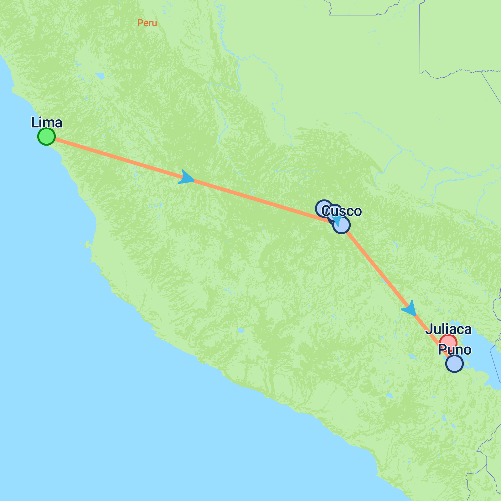 This 7-day adventure starts in Lima and finishes in Juliaca, offering a fantastic blend of history, culture, and stunning landscapes. Youll explore Limas colonial charm before flying to Cusco to discover Inca ruins and vibrant local markets. The Sacred Valley reveals traditional crafts and impressive fortresses, followed by a scenic train journey to the iconic Machu Picchu. The trip continues through the Andes to Puno, where youll visit the fascinating Uros floating islands and Taquile Island, experiencing authentic indigenous culture. With a perfect mix of archaeological wonders and breathtaking scenery, this tour is ideal for those wanting to dive deep into Perus rich heritage.