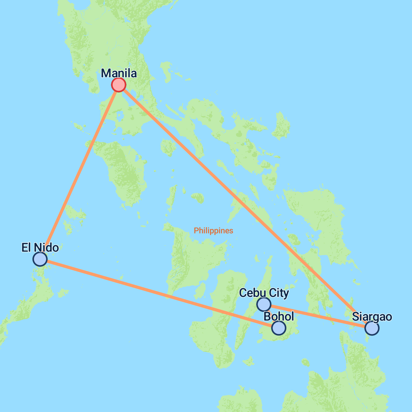 Manila - El Nido. Today, you will depart from Manila on a flight to El Nido, Palawan, a region often celebrated for its white-sand beaches, dramatic limestone cliffs, and crystal-clear waters.
