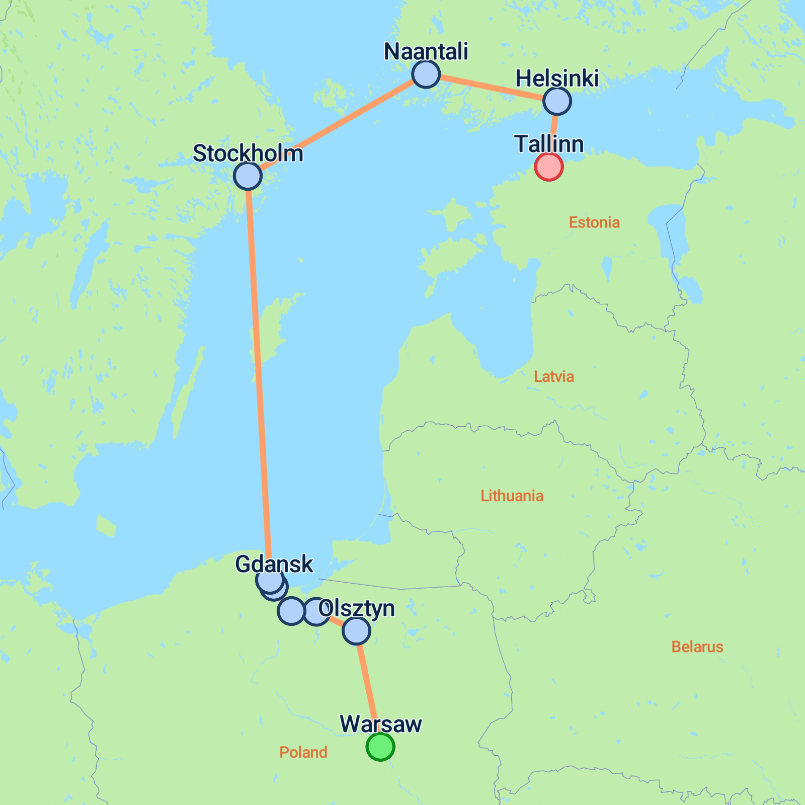 Kick off your adventure in Warsaw with a journey through history and culture over 11 unforgettable days. Begin by exploring Warsaws charming old town, before heading north to discover the wooden wonders of Olsztyn and the impressive Malbork Castle. Embrace the vibrant seaside vibe of Sopot and board a ferry to stunning Stockholm, where history meets modernity on 14 islands. Continue your odyssey to Finland, winding through Naantali's quaint streets and Helsinki's architectural gems. Cross the Baltic Sea to the medieval magic of Tallinn, where cobbled streets await your roaming. Wrap up your captivating tour in this enchanting Estonian city.
