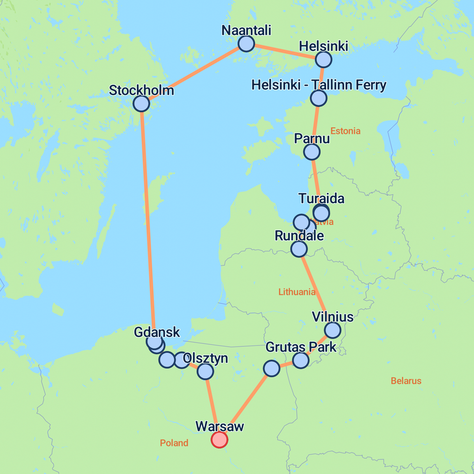 Embark on a delightful 16-day journey starting and ending in Warsaw, exploring the cultural and historical wonders of Poland and the Baltic region. Discover Warsaw's historic charm and the picturesque landscapes of Northern Poland, stopping by the impressive Malbork Castle. Sail across the Baltic Sea to explore the vibrant cities of Gdansk and Sopot, then venture to Sweden's captivating capital, Stockholm. Experience Finland's serene beauty, and cross into Estonia to stroll through Tallinn's medieval streets. The journey continues through Latvia's charming, scenic routes, ending in Lithuania's stunning Vilnius. A rich blend of history, culture, and breathtaking scenery awaits you.