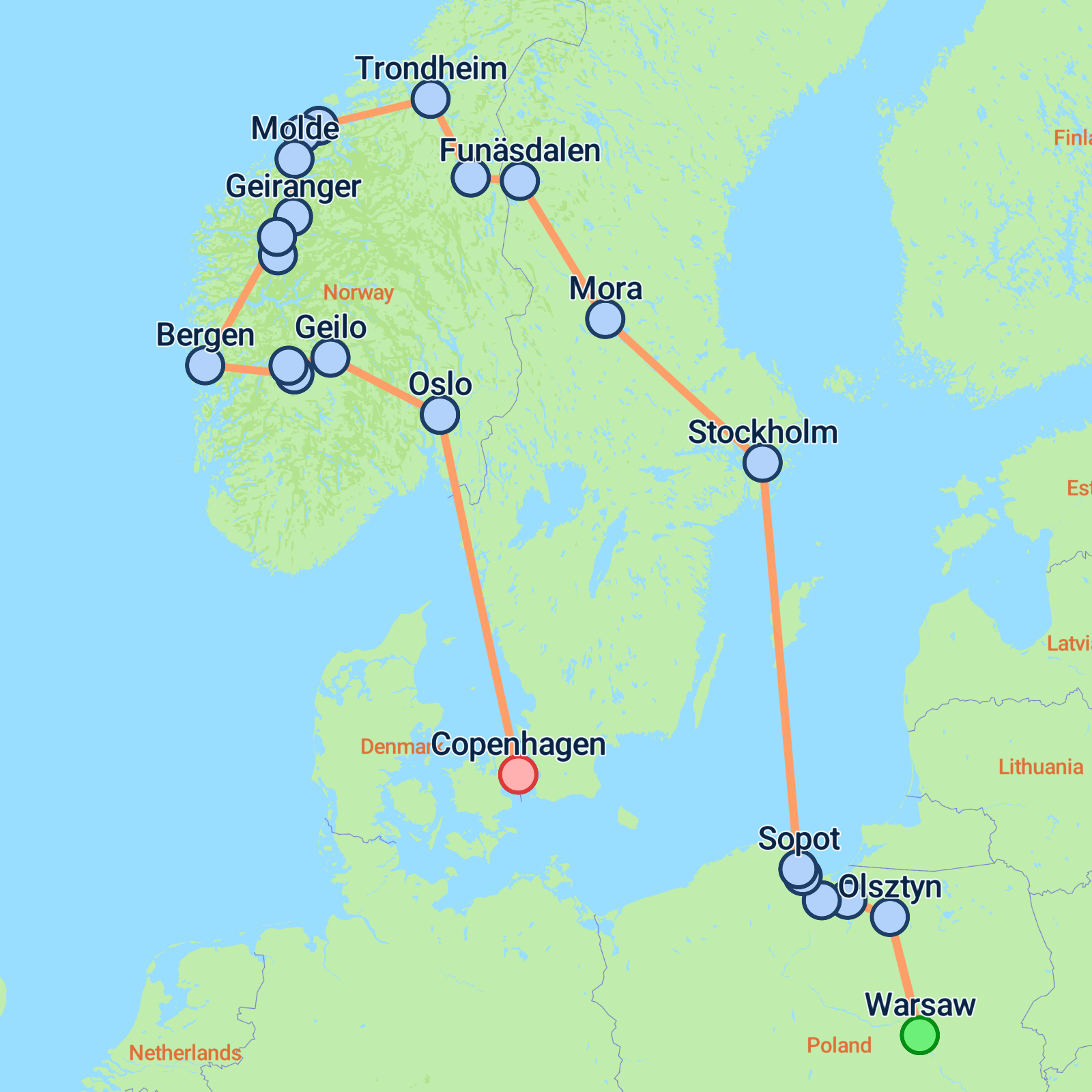 Begin your adventure in the vibrant city of Warsaw, where you'll explore its historic charm and modern vibe over two days. This 14-day journey takes you from Poland to the picturesque northern landscapes of Sweden, through the captivating fjords of Norway, and concludes in Denmark's cultured capital, Copenhagen. Highlights include a visit to the majestic Malbork Castle in Poland, a ferry ride from Sopot to Sweden, and the breathtaking Atlantic Road in Norway. Discover the idyllic town of Mora and the UNESCO-listed Geiranger Fjord, and sample Copenhagen's famed hygge lifestyle. This diverse tour promises unforgettable memories and stunning scenery.