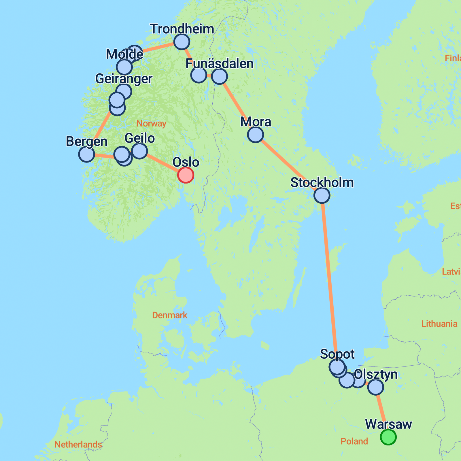 This captivating 13-day tour kicks off in Warsaw and wraps up in Oslo, offering an unforgettable experience across Poland, Sweden, and Norway. Begin with a fascinating exploration of Warsaw's blend of modernity and history, before venturing north to Olsztyn and the iconic Elblag Canal. Marvel at the impressive Malbork Castle and soak in Gdansk's vibrant atmosphere. Cross the Baltic Sea to Sweden's stunning capital, Stockholm, rich in cultural landmarks. Journey through Norway's breathtaking landscapes from Trondheim to Bergen, traversing majestic fjords, picturesque towns like Geiranger, and the thrilling Atlantic Road. Expect to see showcase fjords, lush forests, cascading waterfalls, and quaint fishing villages before concluding your adventure in the vibrant city of Oslo.
