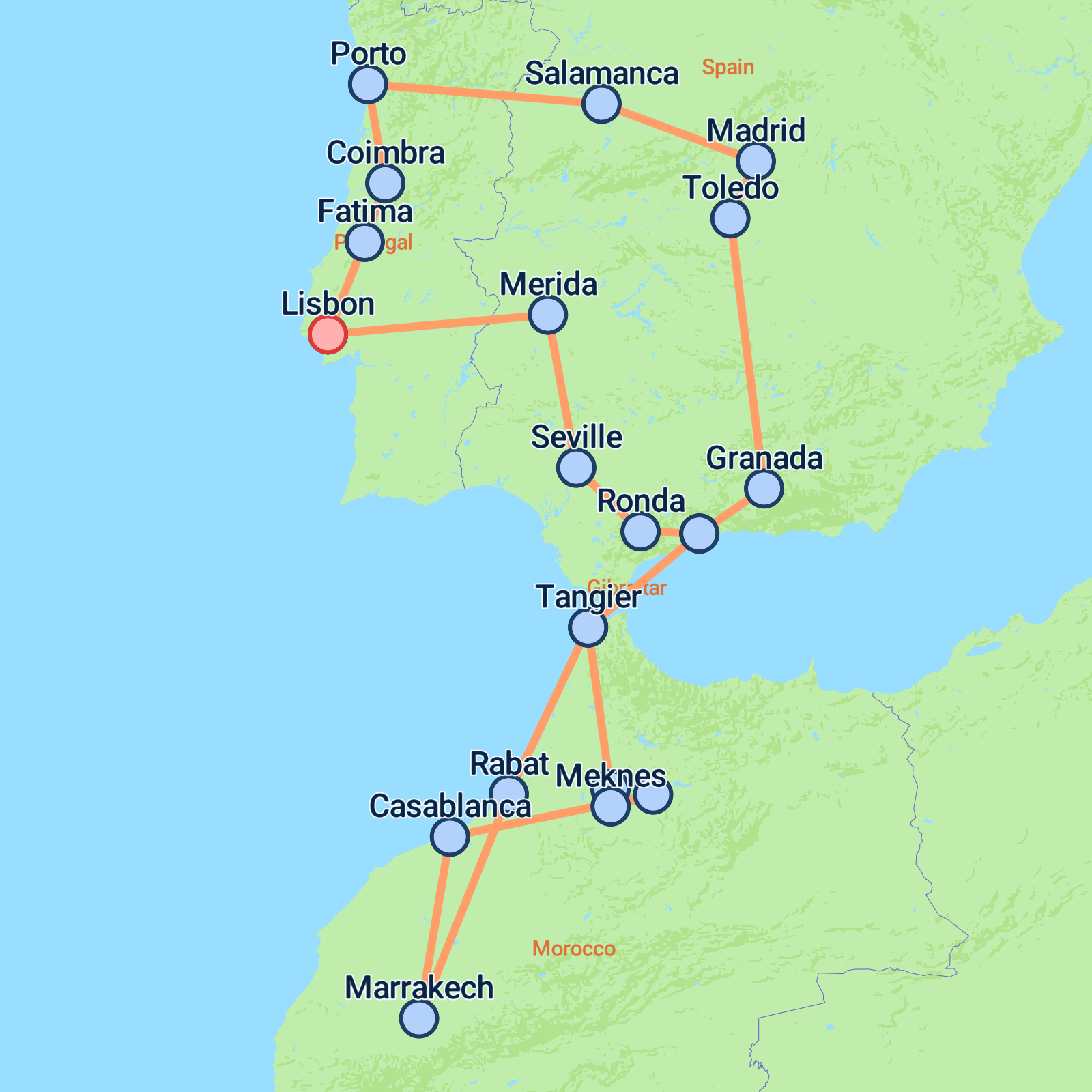 Experience an unforgettable 15-day journey through Portugal, Spain and Morocco, starting and ending in Lisbon. Travel from the Roman ruins of Mérida and the lively streets of Seville to the sun-drenched Costa del Sol before crossing to Tangier. Explore Morocco’s imperial cities—Fes, Marrakesh and Rabat—each bursting with history, souks and culture. Returning to Spain, you’ll discover Granada’s Alhambra, Toledo’s medieval charm and Madrid’s grand boulevards. Finish in Porto and Coimbra before visiting Fátima’s revered sanctuary. This incredible adventure blends Moorish heritage, Iberian beauty and Mediterranean spirit into one seamless, culture-rich experience.