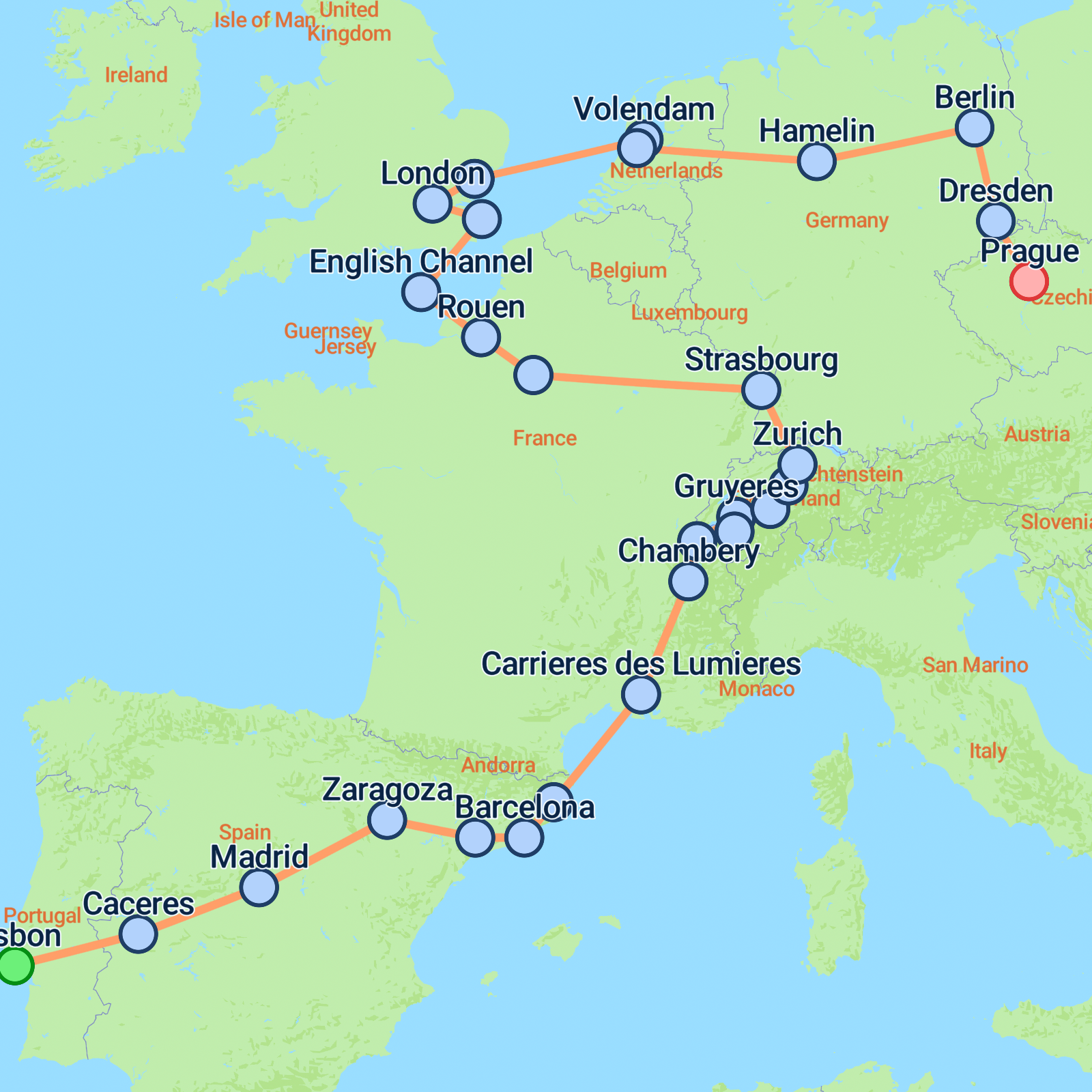 Set off from the charming city of Lisbon and journey through Europe over a fascinating 21-day adventure, concluding in the mesmerising city of Prague. Expect to see the vibrant streets of Madrid, Barcelona's incredible architecture, and the artistic flair of Paris. Youll explore the idyllic landscapes of Switzerland, including a thrilling visit to Glacier 3000, and marvel at the historic towns like Canterbury and Rouen. Experience a taste of Amsterdams vibrant energy and dive into Berlins storied past. From the bustling markets of London to the serene waterways of Venice, this tour offers a delightful blend of culture, history, and breathtaking scenery.