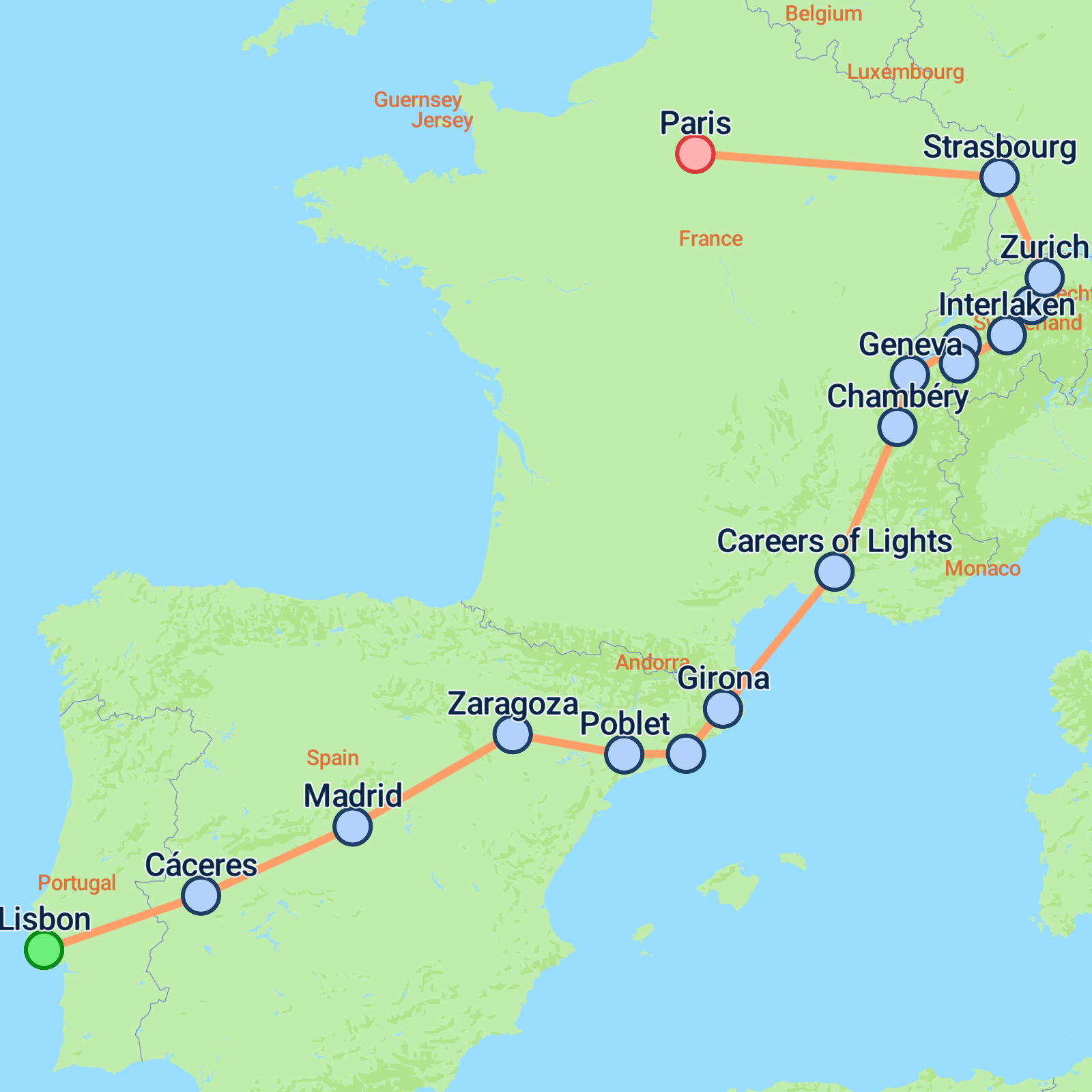 Embark on a captivating 13-day journey from Lisbon to Paris, exploring some of Europe's most enchanting locations. Start in Lisbon, where youll delve into its iconic seven hills and charming alleys. Cross into Spain, visiting the historic heart of Cceres and the vibrant life of Madrid. In Barcelona, Gauds architectural masterpieces await, before you venture into the artistic wonders of Provence. Discover the picturesque landscapes of Switzerland, with highlights including the interactive Maison Cailler Chocolate Factory tour and breathtaking views from Glacier 3000. Conclude your adventure in Paris, where youll see the Eiffel Tower and enjoy a serene Seine cruise. This tour offers a rich tapestry of cultural gems, scenic vistas, and unforgettable experiences.