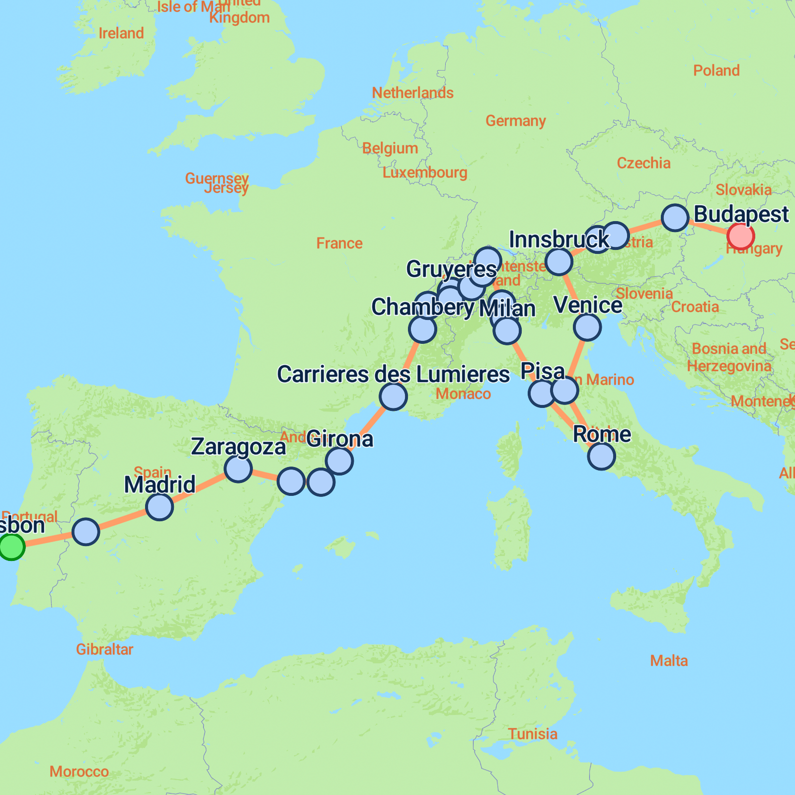 Start your adventure in the vibrant city of Lisbon and end in the charming Budapest over a thrilling 19-day journey. Experience the rich culture and dramatic history of Europe as you explore the bustling plazas and iconic sights of Lisbon and Madrid, and savour the artistic flair of Barcelona and the picturesque charm of Girona. Wander through the medieval streets of Cceres and admire the architectural beauty of Florence. You'll gaze upon the Leaning Tower of Pisa, stroll through Vienna's majestic avenues, and cruise along Salzburg's serene lakes. This tour promises a captivating blend of city buzz and breathtaking landscapes from the Swiss Alps to the Italian Lakes.