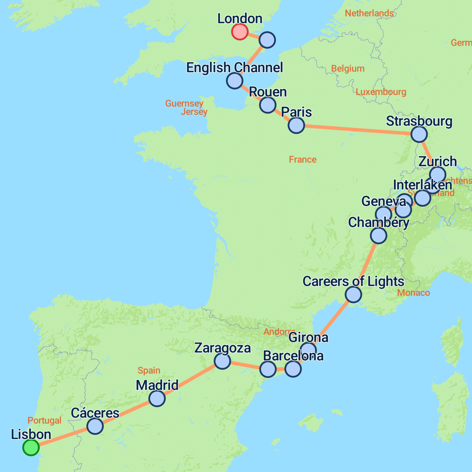 Begin your 16-day adventure in Lisbon, where youll enjoy the city's maritime heritage and charming neighbourhoods. Travel through scenic Alentejo to Caceres, then onto vibrant Madrid, featuring grand boulevards and Retiro Park. Explore Zaragosas architectural beauty and uncover Barcelona's modernist marvels. Discover Gironas vibrant history before crossing into France to experience Arles' artistry and the incredible Carrires des Lumires show. Journey into Switzerland for Geneva's elegance, Gruyres' cheesy delights, and Glacier 3000s breathtaking views. Continue to Paris for iconic landmarks and delve into Rouen's medieval charm before reaching historical Canterbury and London. This tour promises a blend of picturesque landscapes, rich culture, and vibrant cities.