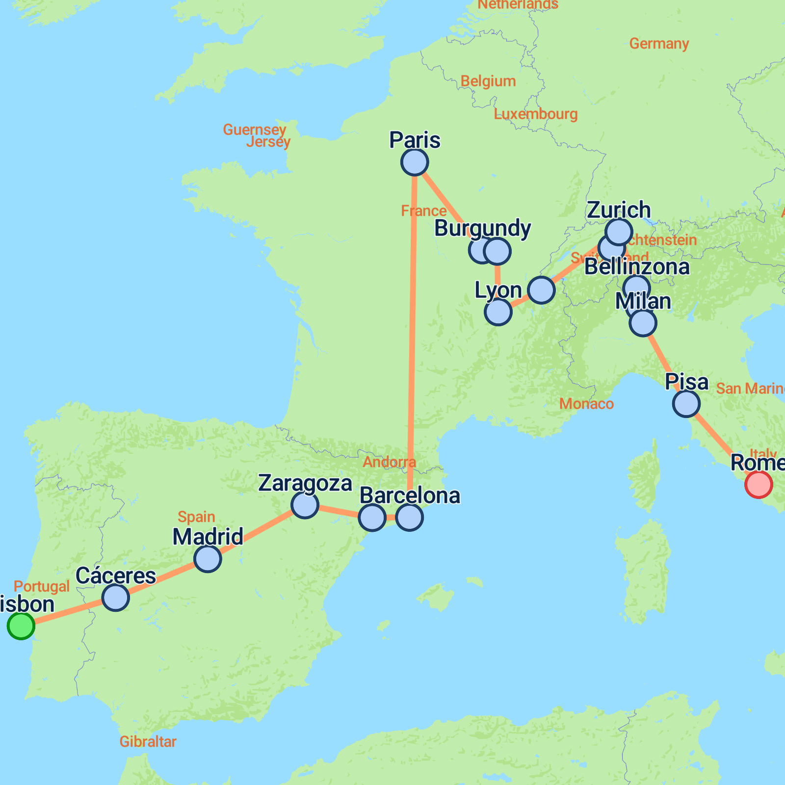 Kick off your 17-day adventure in vibrant Lisbon and wrap it up in the eternal city of Rome. Journey across captivating Portugal, Spain, France, Switzerland, and Italy, exploring stunning landscapes and rich histories along the way. In Lisbon, soak in the charm of its seven hills and captivating Belem neighbourhood. Wander through the medieval streets of Caceres and feel the buzz of Madrid's bustling plazas. Glide on a high-speed train from Barcelona to Paris, where youll marvel at the Eiffel Tower and wander Montmartre. Cruise Lake Zurich, explore the picturesque Lucerne, and be amazed by Pisa's Leaning Tower. This tour promises a delightful mix of culture, history, and scenery, ensuring an unforgettable European odyssey.