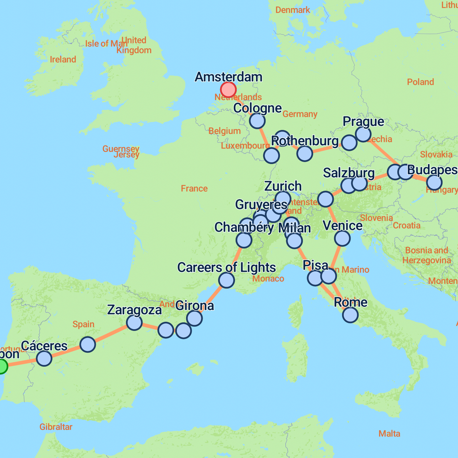 Embark on an unforgettable 24-day journey starting in Lisbon and ending in Amsterdam. Experience the charm of Lisbon's historical Belem neighbourhood, then explore Spain with stops in vibrant Madrid and stunning Barcelona. Cross the border into France and Switzerland, where you'll visit picturesque towns like Lausanne and Lausanne. Enjoy the breathtaking mountain scenery at Glacier 3000 and visit iconic Italian destinations such as Milan, Pisa, and the magical canals of Venice. Continue into Austria's alpine beauty, including Salzburg and Vienna, before exploring Budapest, Bratislava, and Prague's historical splendour. The tour concludes with scenic Germany and the captivating windmills of Zaanse Schans in the Netherlands. Expect an array of cultural experiences, breathtaking scenery, and unforgettable memories.