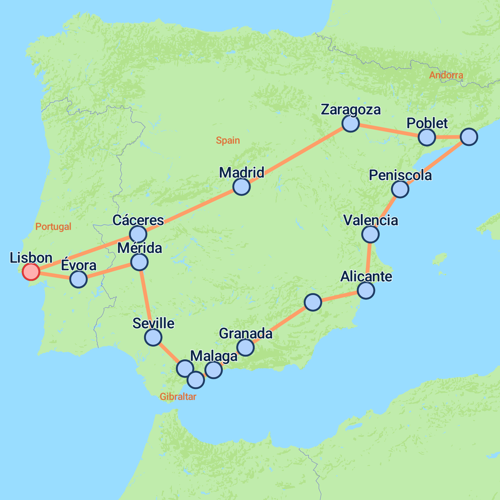 Embark on a captivating 13-day adventure from Lisbon to Lisbon, where each day promises a tapestry of rich experiences. Begin by exploring the vibrant capital of Portugal, soaking in the charm and iconic sites like the Belem neighbourhood. Journey through the scenic Alentejo region to Spain, stopping in medieval Cceres and vibrant Madrid. Discover Zaragoza, Poblet Abbey, and the architectural wonders of Barcelona. Delight in the Mediterranean allure of Valencia and Alicante before venturing into Andalusia, where Granadas Alhambra awaits. Meander through Malaga and Marbella, with a picturesque drive to Sevilles cultural heart. Finally, return via Mrida and vora, filled with cultural gems and picturesque landscapes.