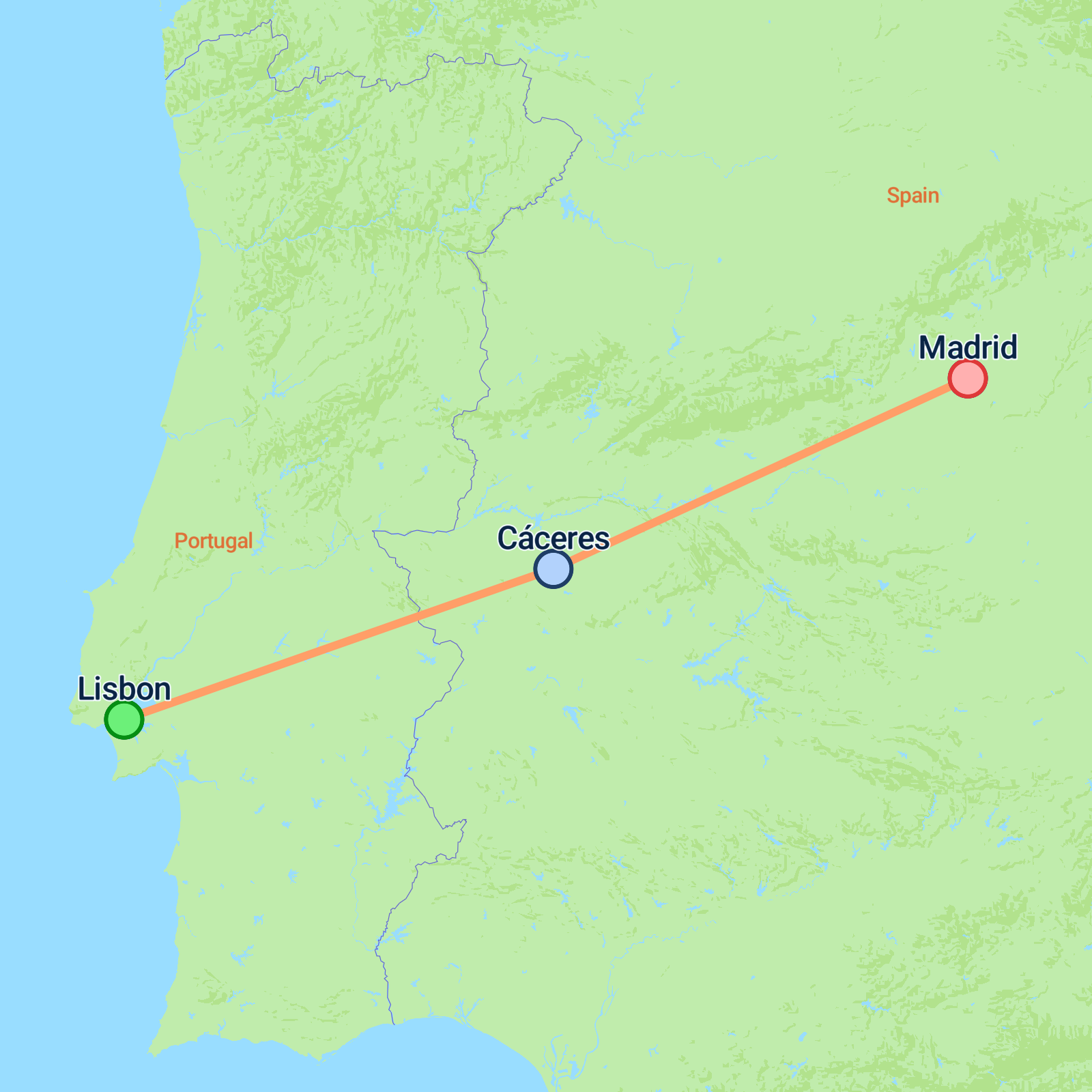 We set off early from Portugal, travelling through the scenic Alentejo region. Our first stop is in Estremoz, a charming town known for its medieval castle, cobblestone streets, and beautiful architecture that encapsulates the essence of Portugal. Here, we pause for a refreshing coffee. Continuing our journey, we head towards Spain, arriving in Cceres. You'll have the opportunity to enjoy lunch and wander around its historic centre, renowned for its remarkably preserved medieval and Renaissance buildings. Later, we journey to Madrid, reaching the city in the evening. We'll drop you off at Plaza Mayor, where you can immerse yourself in the lively atmosphere, surrounded by an array of restaurants and bustling activity.
