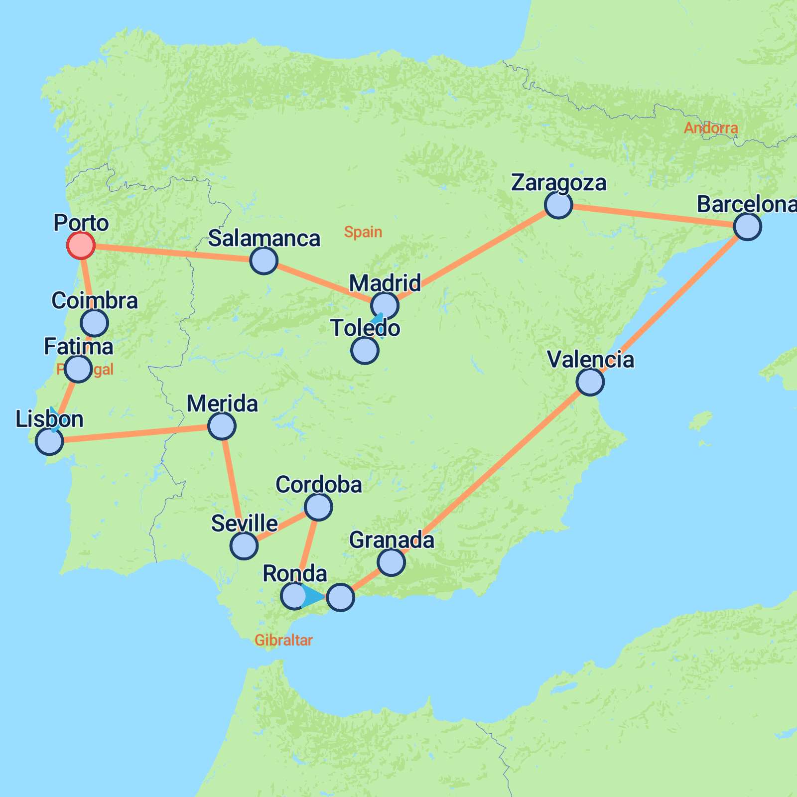 Journey across Portugal and Spain on this 15-day tour from Porto to Madrid and back. Begin in Porto before travelling through Coimbra, Fátima and Lisbon, then continue across the border to Seville, Córdoba and Granada. The route moves onward to Valencia and Barcelona before reaching Madrid and Toledo, concluding with a visit to Salamanca and a return to Porto.