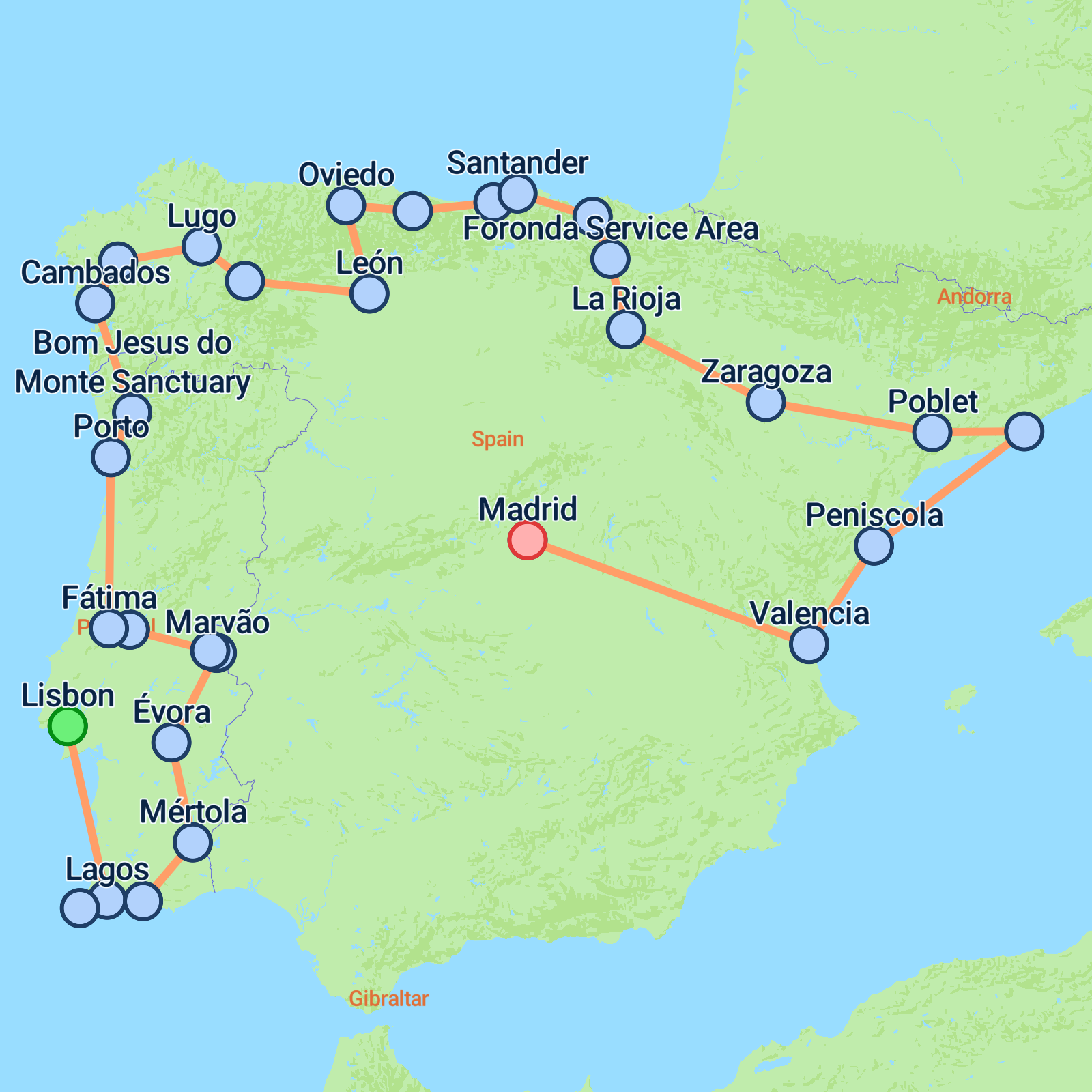Embark on a fascinating 15-day journey starting in the charming Portuguese capital, Lisbon, and ending in the vibrant city of Madrid. You'll explore the iconic sites of Lisbon, such as the historic Belem neighbourhood and Bairro Alto. As you journey south to Algarve, discover the captivating city of Lagos and the windswept cliffs of Cape St. Vincent. In Evora, explore the Chapel of Bones and enjoy guided tours through historical towns like Mrtola and Marvo. Travel into northern Portugal and Spain, visiting the lively Porto, the stunning Santiago de Compostela, and the elegant Santander. In Spain, marvel at Bilbao's Guggenheim, tour Zaragoza, and embrace the modernity of Valencia before concluding your adventure amidst Madrid's cultural richness. Expect to see a blend of beautiful scenery, rich history, and vibrant cityscapes.