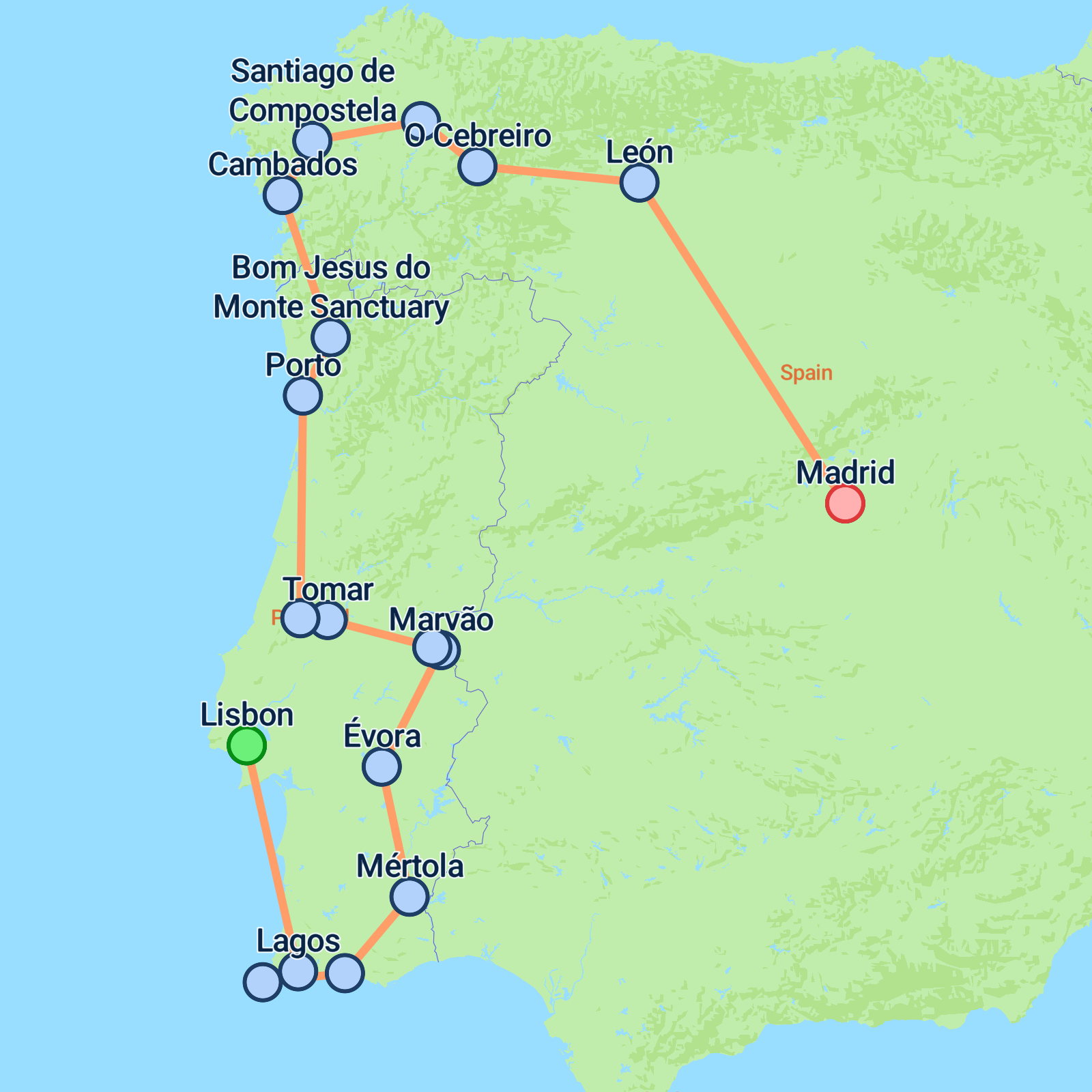 Start in the captivating city of Lisbon on this 9-day tour, which culminates in vibrant Madrid. Spend your first days exploring Lisbons charming alleys, iconic tiles, and historic neighbourhoods like Belem and Bairro Alto. As you journey south, discover the Algarve with its stunning beaches and the ancient city of Lagos, then head to the dramatic cliffs of Cape St. Vincent. Enjoy cultural treasures in the Alentejo region, including voras Chapel of Bones. The scenic adventure continues through charming villages and notable landmarks, like Portos lively Ribeira district and Santiago de Compostelas renowned pilgrimage sites. Expect a diverse blend of landscapes, culture, and unforgettable experiences.