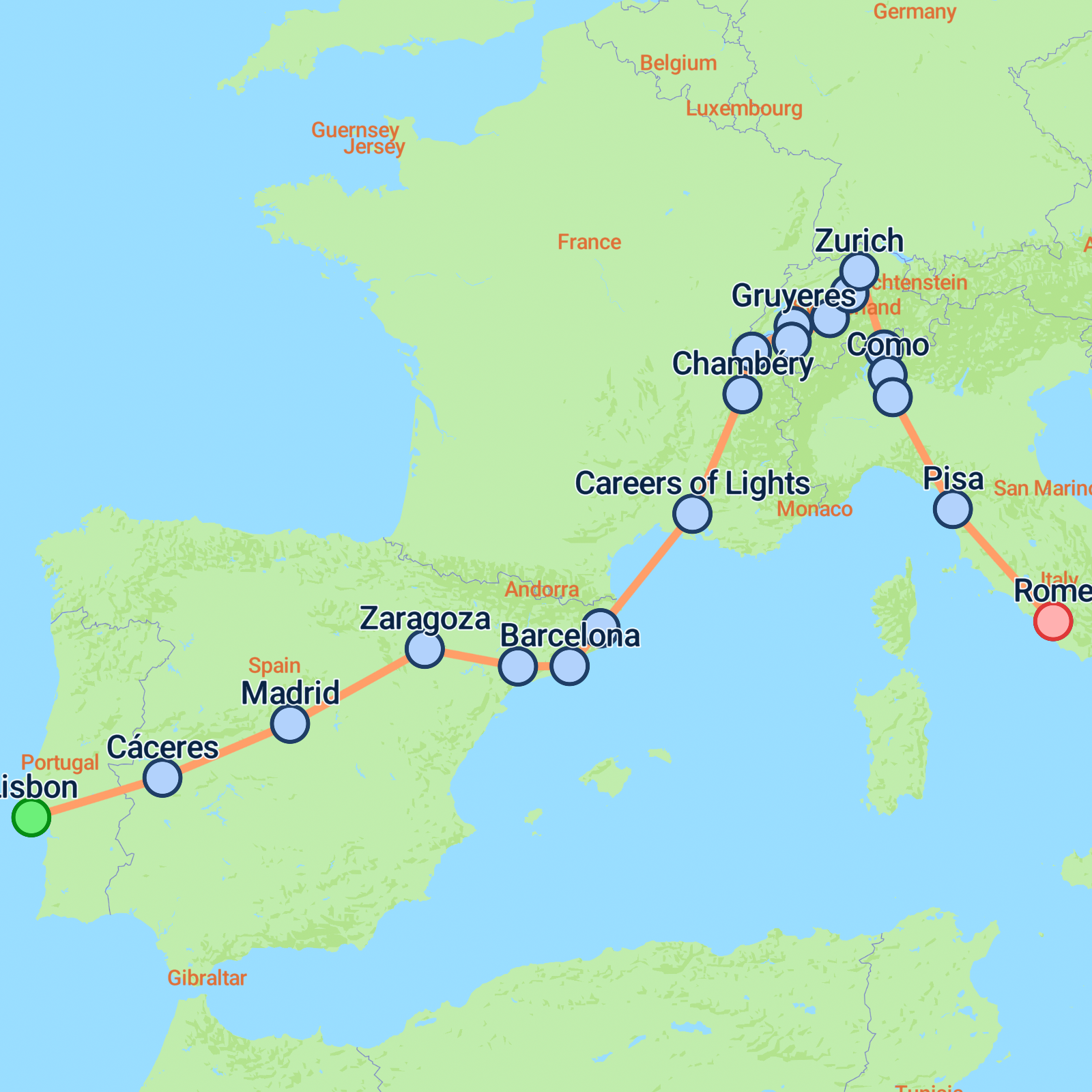 Embark on a captivating 13-day adventure that begins in the vibrant city of Lisbon and concludes in the historical splendour of Rome. This tour offers a delightful mix of culture, history, and stunning landscapes. Experience the charm of Lisbons iconic tiles and bustling Bairro Alto before wandering through Madrid's lively Plaza Mayor. Journey through Spain and France, marvelling at the medieval towns of Zaragoza and Poblet Abbey, and enjoy a taste of Swiss chocolate and cheese in Gruyres. Discover the breathtaking Swiss Alps and the beauty of Italy with stops in Milan and Pisa, ultimately relishing the timeless allure of Rome. With each day bringing new discoveries, this tour is a travellers dream come true.