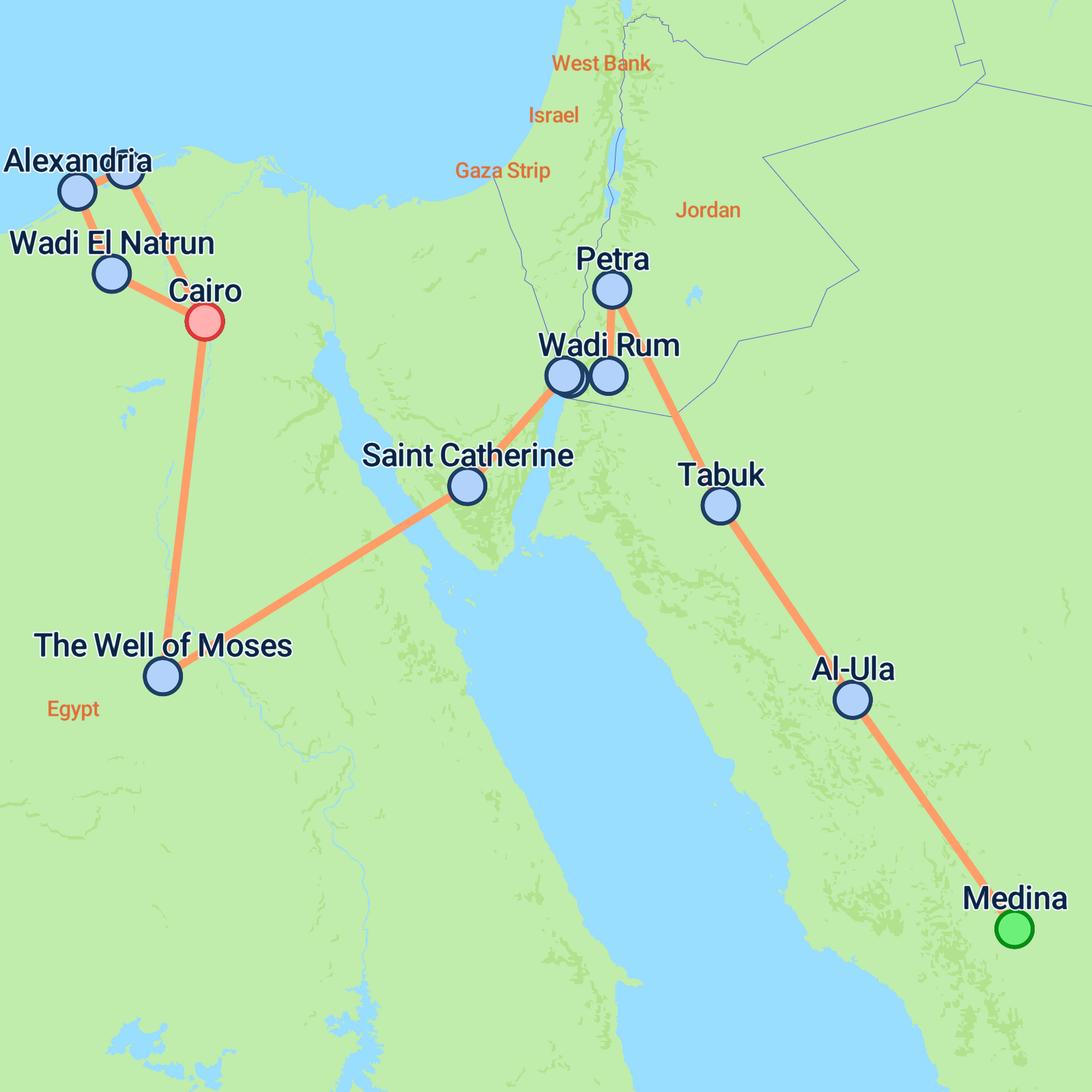 Embark on an 11-day journey from the sacred city of Medina to the bustling heart of Cairo. This tour invites you to explore spiritual and historical landmarks in Medina, including the Prophet's Mosque and Quba Mosque, before heading to the awe-inspiring rock formations of Al-Ula and the UNESCO World Heritage site of Hegra. Discover the wonders of Petra and the vast desert landscapes of Wadi Rum, where you'll enjoy a thrilling 4x4 ride and camel trek. In Egypt, explore the iconic pyramids, the vibrant streets of Alexandria, and the Coptic monasteries of Wadi Natrum. End with a scenic boat ride on the Nile, taking in the idyllic views near Rosetta. Enjoy a blend of history, culture, and stunning landscapes across three countries.